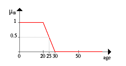 A more natural way to construct the set B would be to relax the strict separation between young and not young. We will do this by allowing not only the (crisp) decision YES he/she is in the set of young people or NO he/she is not in the set of young people but more flexible phrases like Well, he/she belongs a little bit more to the set of young people or NO, he/she belongs nearly not to the set of young people.