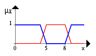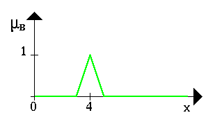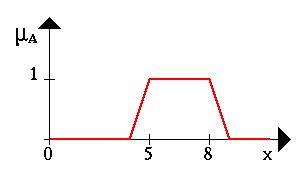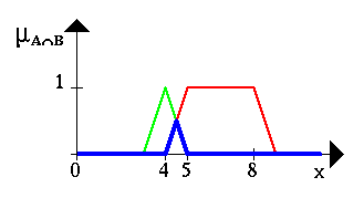 The following figure shows the fuzzy set between 5 and 8 AND about 4 (notice the