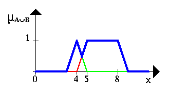 The Fuzzy set between 5 and 8 OR about 4 is shown in the next figure (again,