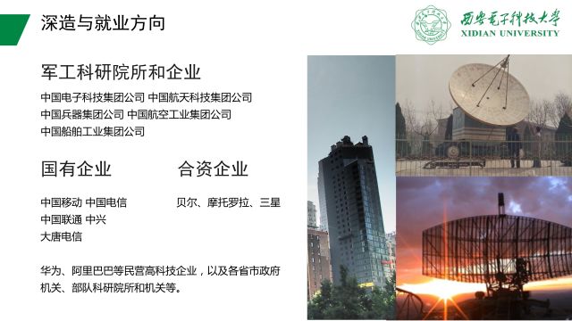 本專業的畢業生可考取電磁場與微波技術、電路與系統、信號與信息處理等專業的研究生,保送清華大學等重點高校研究生的比例較高,近五年的上研率40%以上。畢業生主要面向電子、航天、航空、船舶、兵器等科研院所、工業部門和管理部門,從事與電磁場與無線技術專業相關的科學研究、產品研發和技術服務等技術、教學及管理工作。就業率達98%以上,受到用人單位的青睞。