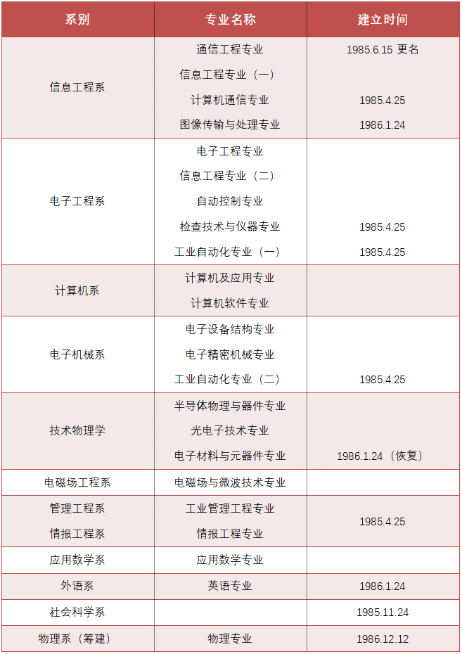 此時的專業設置,改變了以設備設專業的狀況,開啟了以學科設專業的新篇章。1979年成立電磁場工程系(六系),全校共設17個專業。截至1986年年底,全校共有10個系23個專業(物理系籌建中)。