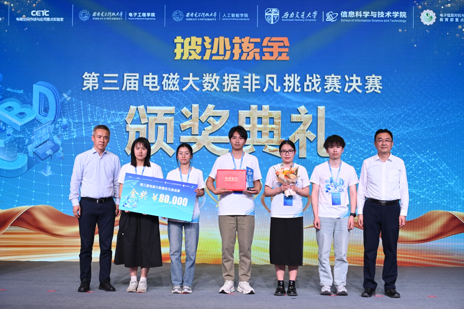 經過近四個小時的角逐,本屆大賽的最終成績揭曉。“電磁承鋒”團隊斬獲金獎,LLM團隊、NJUST_KMG團隊摘得銀獎,QiiQ團隊、ZAB團隊、ABC團隊獲得銅獎。楊建橋、郭俊為金獎團隊頒獎,電子空間作戰與應用重點實驗室學術委員會資深委員李廷立、二十九所副總工程師楊政以及學校電子工程學院黨委書記楊光暐、通信工程學院黨委書記魏峻、人工智能學院黨委書記張毅等為銀獎和銅獎團隊頒獎。