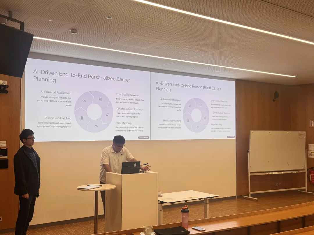 在結業匯報中,同學們圍繞“智能萬物互聯”與“構建AI代理”為主題進行展示,由慕尼黑工業大學專家現場點評,并結合匯報內容提出精準的優化建議與實踐改進路徑,從學術邏輯、創新視角等層面提供專業指導,助力同學們進一步提升思考深度與成果呈現的邏輯性。