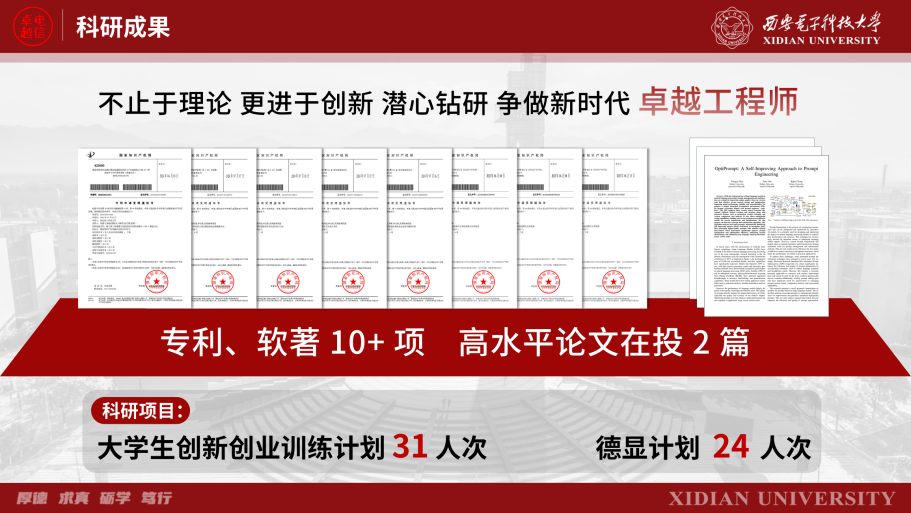2202018班全員配備科研導師,以國家重點科技戰略發展領域和重大工程需求為導向,實施動態流動機制。在2023-2024學年,該班綜合測評學習成績107.7分,位列全院第一,大學生英語六級通過率100%。全班同學積極參加學科競賽,共獲國創省創結題31人次,各類學科競賽獲省部級以上獎項101人次,校級競賽獲獎實現班級全覆蓋。學習之余,班級同學不忘反哺社會,先后有5名同學參與科技支教扶貧活動,9名同學參加社會實踐,并獲省級優秀團隊榮譽。德智體美勞全面發展,多名同學代表學校參加全國大學生藝術團展演、體育賽事等。