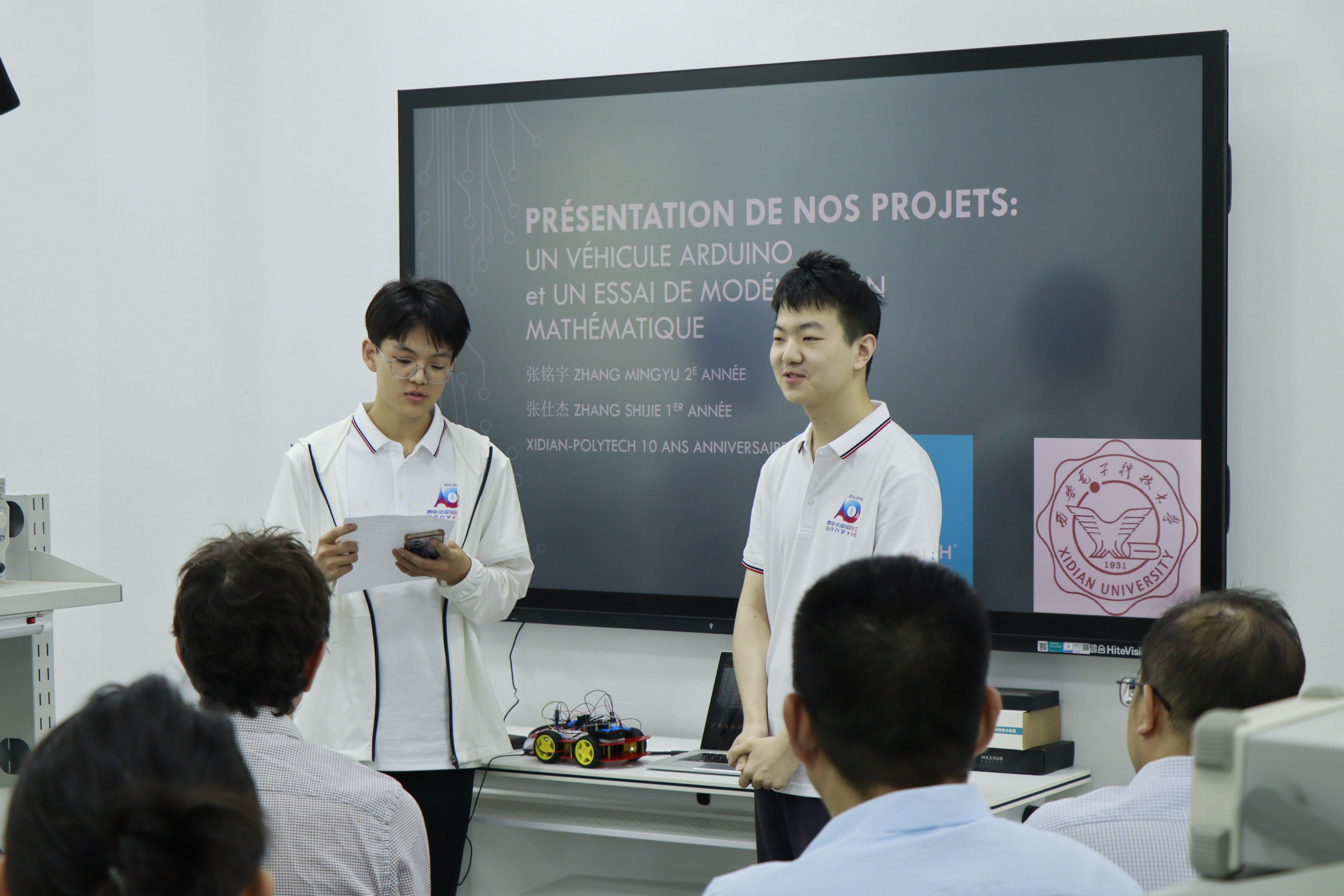 隨后,學生們與法方代表用法語進行了面對面交流,分組展示了自己的課余興趣作品,包括智能垃圾桶、密碼鎖、智能小車等硬件和軟件作品,涉及到生活中的各個方面。外教對學生們的作品贊不絕口,對同學們的學習和實踐能力也表示肯定。通過此次展示,進一步加深了同學們對實踐和科研的認識和興趣,同時也讓外教看到了項目學生的潛力,促進了不同文化背景下科研人員之間的相互理解和合作。