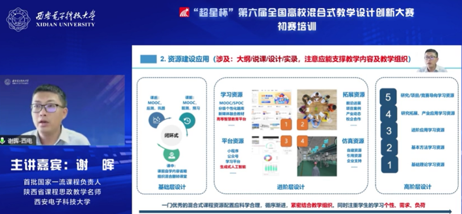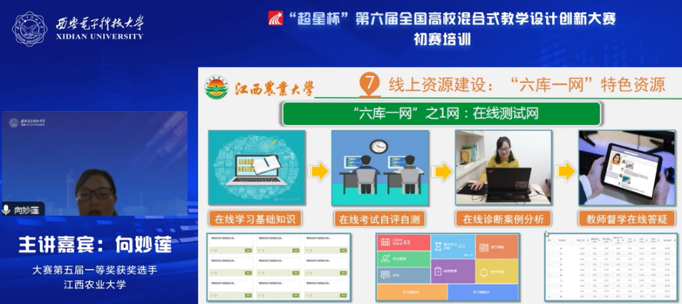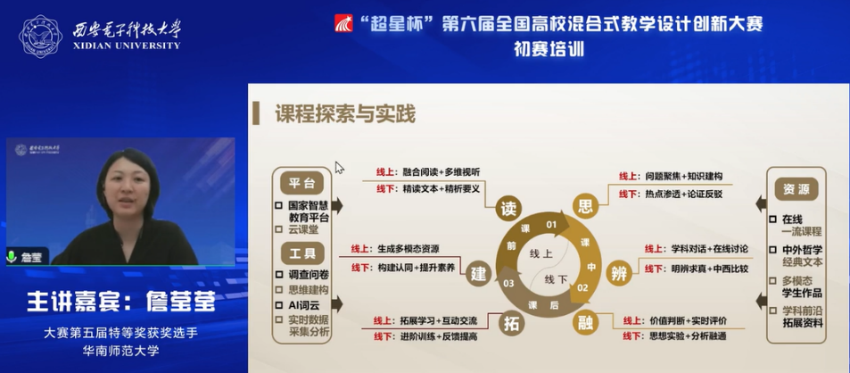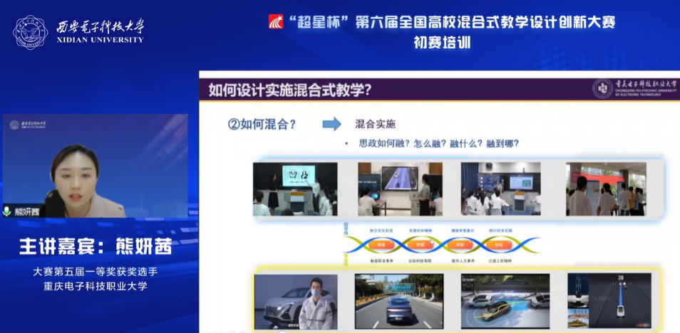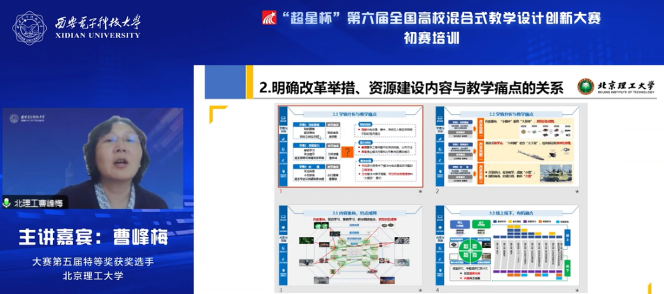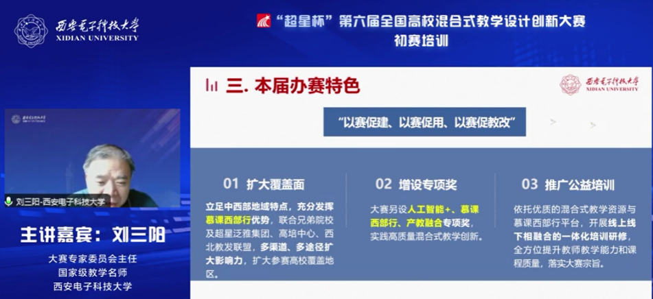 (通訊員 李雨煙)近日,“超星杯”第六屆全國高校混合式教學設計創新大賽初賽培訓在線舉行。本次培訓由西安電子科技大學、超星泛雅集團共同主辦,由中國高等教育培訓中心協辦,由西安電子科技大學本科生院教學發展中心、電子工程學院承辦。培訓分3場專題報告會,邀請知名專家與往屆獲獎選手進行備賽要點與經驗分享,通過西電教發公眾號、超星平臺、中國高等教育培訓中心公眾號等多個渠道進行了直播,累計2萬余人在線觀看。