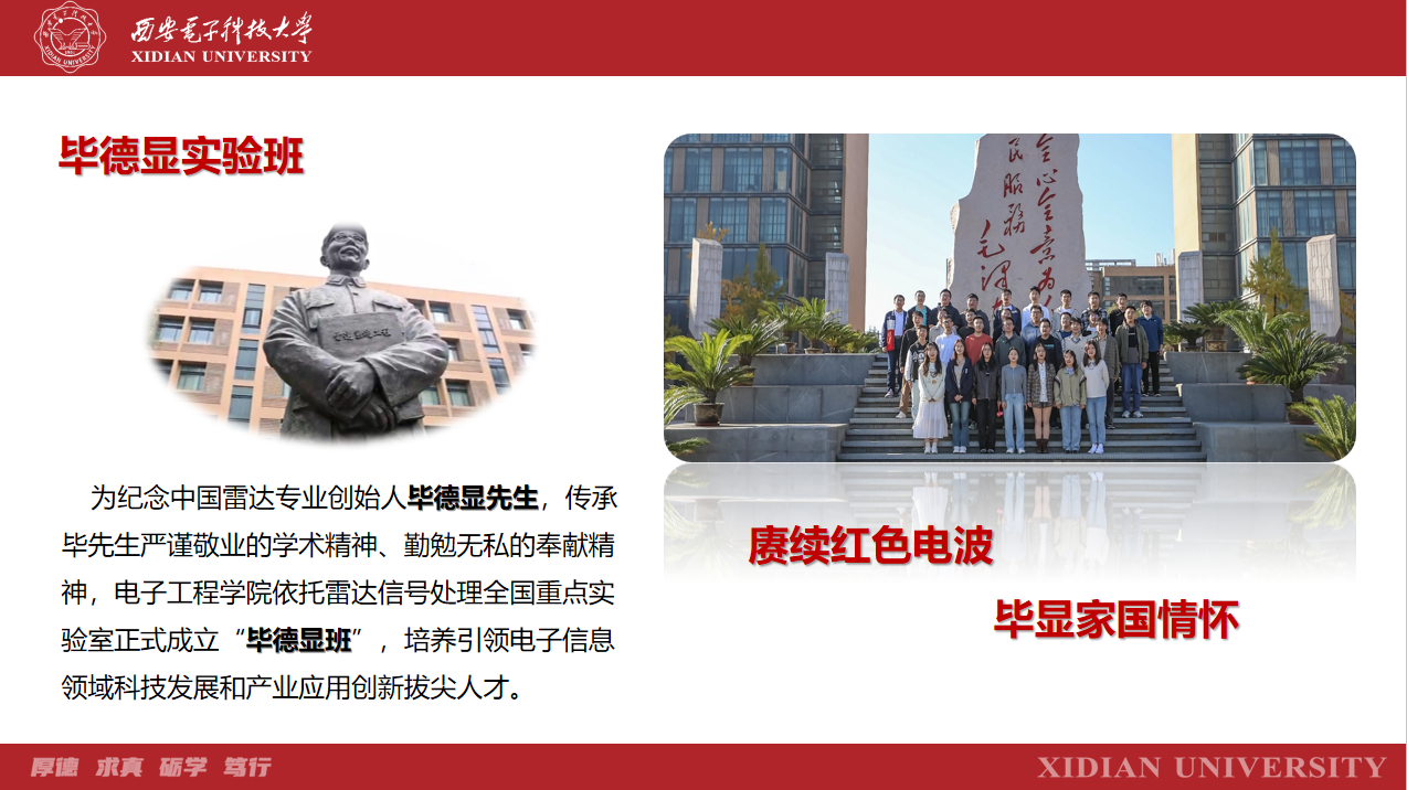 賡續紅色電波,畢顯家國情懷。為紀念電子工程學院創始人畢徳顯先生,傳承西電紅色基因,延續老一輩雷達先驅們的開拓精神,實踐“三全育人”體系,培養引領電子信息領域科技發展和產業應用創新拔尖人才,“畢徳顯班”于2019年10月正式成立。