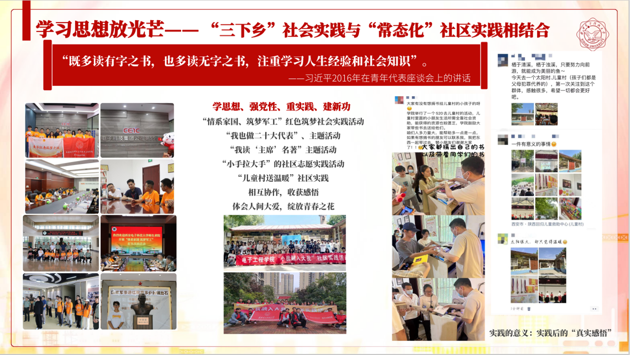 思想強、學習思想放光芒:“向黨組織靠攏,行動踐行紅色理想”。班級積極將“三下鄉”社會實踐與“常態化”社區實踐相結合,在寒暑假及課余時間,班級同學足跡遍布大江南北;支教偏遠地區、宣揚紅色文化,爭做有理想、敢擔當、能吃苦、肯奮斗的時代青年;開展系列實踐活動,如“情系家國、筑夢軍工”紅色筑夢社會實踐活動,“我也做二十大代表”、“我讀‘主席’名著”等主題活動,“小手拉大手”、“兒童村送溫暖”的社區志愿實踐活動。同學們相互協作,收獲感悟,體會人間大愛,綻放青春的實踐之花。
