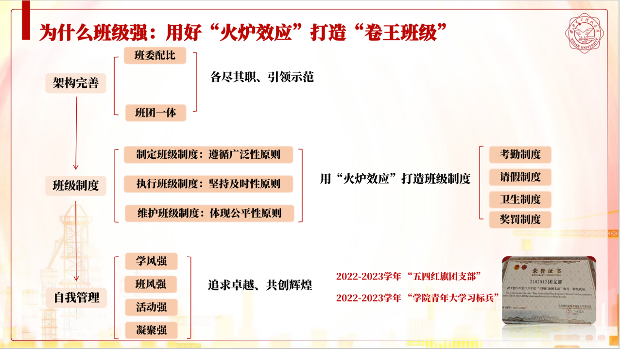 班級強、追求卓越創輝煌:積極用好“火爐效應”打造“卷王班級”。完善架構,班委各盡其職、引領示范;從遵循廣泛性、堅持及時性、體現公平性三個原則制定班級制度;最終實現學生的自我管理,打造“學風強、班風強、活動強、凝聚強”的優良班風。上一學年獲校級“五四紅旗團支部”,院級“青年大學習標兵班級”。獲優秀團干稱號2人,優秀團員稱號5人,優秀學生干部2人。