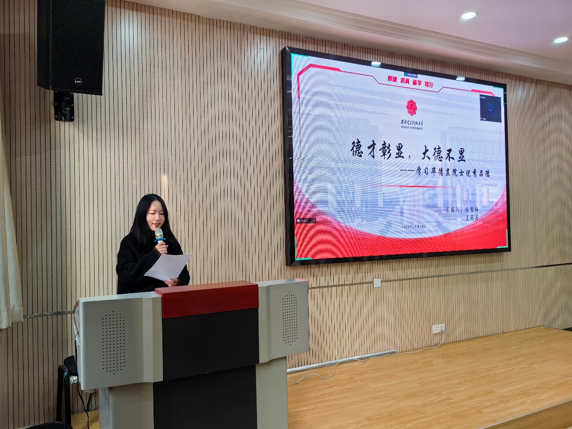 (通訊員 王茜茜任雪梅)為深入學習宣傳貫徹黨的二十大精神,展示西電先輩為國奉獻、砥礪奮進的情懷與擔當,引導廣大研究生團結拼搏,勇擔使命,科技報國,2023年12月19日,電子工程學院“時代之聲”研究生宣講團聯合通院宣講團成員在北校區主樓Ⅲ區201開展“德才彰顯,大德不顯”主題宣講活動,此次宣講人為電子工程學院研究生任雪梅、王茜茜和通信工程學院研究生劉尚恩,共計60余名碩博研究生參與活動。