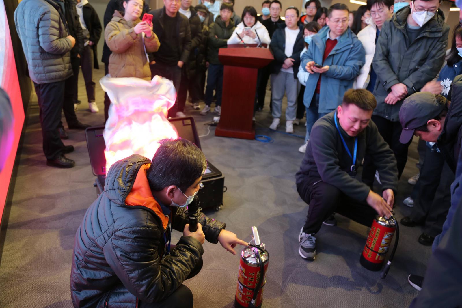 首先,保衛處消防科韓永皓進行了“防患于未‘燃’”的安全培訓。從消防基礎知識、認識消防設施、預防與滅火措施、火場自救與逃生等四個方面進行講解。緊接著,姚昆朋和韓永皓結合電子滅火器及火源,詳細演示滅火器的使用方法:在做好自身防護的前提下,站在火焰上風口,‘提拔握壓’使用滅火器進行滅火。提——提起滅火器、拔——拔掉保險栓、握——握住噴嘴、壓——壓下壓把,距離燃燒物1.5米左右,對準火焰根部掃射進行迅速滅火。