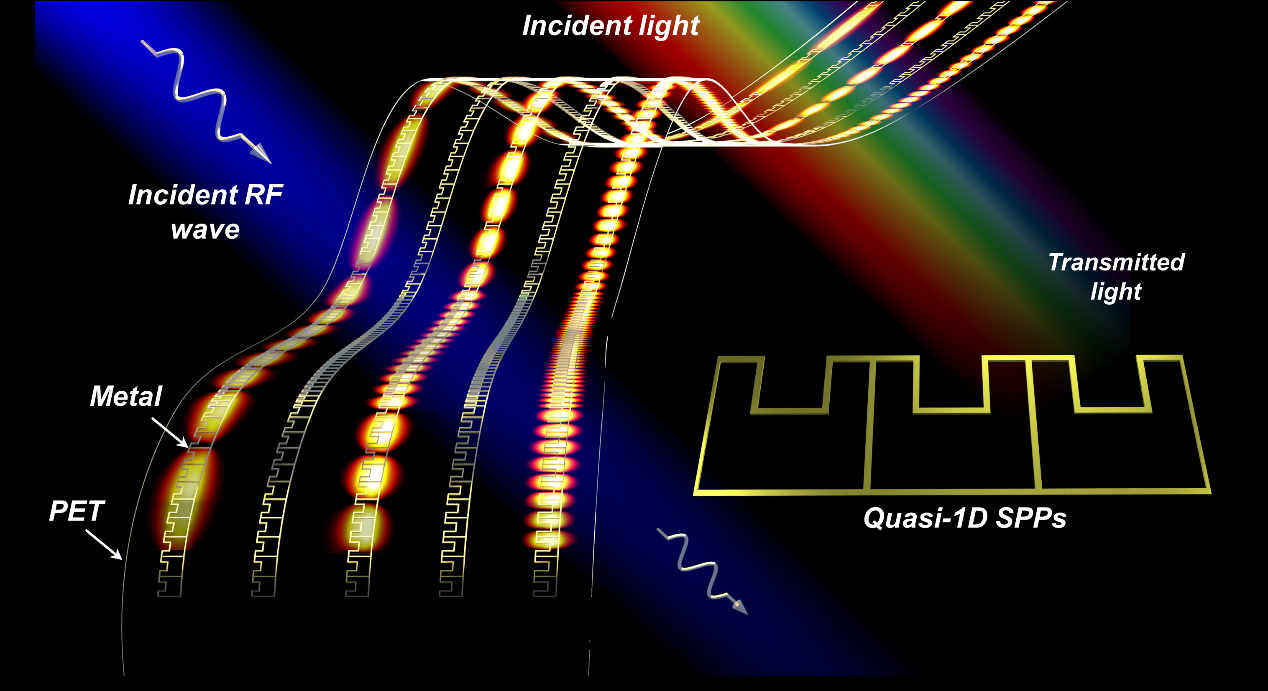 研究團隊創新性地提出了準一維表面等離激元(quasi-1D SPPs)的概念,利用周期性排列的準一維微金屬線構建表面等離激元結構,可實現對表面波的高局域與強束縛,對電磁波具有任意拓撲傳輸與高效輻射轉換等靈活調控能力。相比傳統結構,金屬占比降低兩個數量級以上,同時具有極佳的光學透明與射頻透明特性,在可見光與典型射頻頻段透過率均達到90%以上。準一維表面等離激元能夠實現任意拓撲結構的傳輸并保持電磁能量的低逸散,還能對場束縛性進行有效操控,實現高束縛導行波向低束縛空間波的高效轉換。因此,準一維表面等離激元結構有望構建一系列傳輸型和輻射型透明電磁器件,其極佳的透光特性使其在自然環境下幾乎不可見。