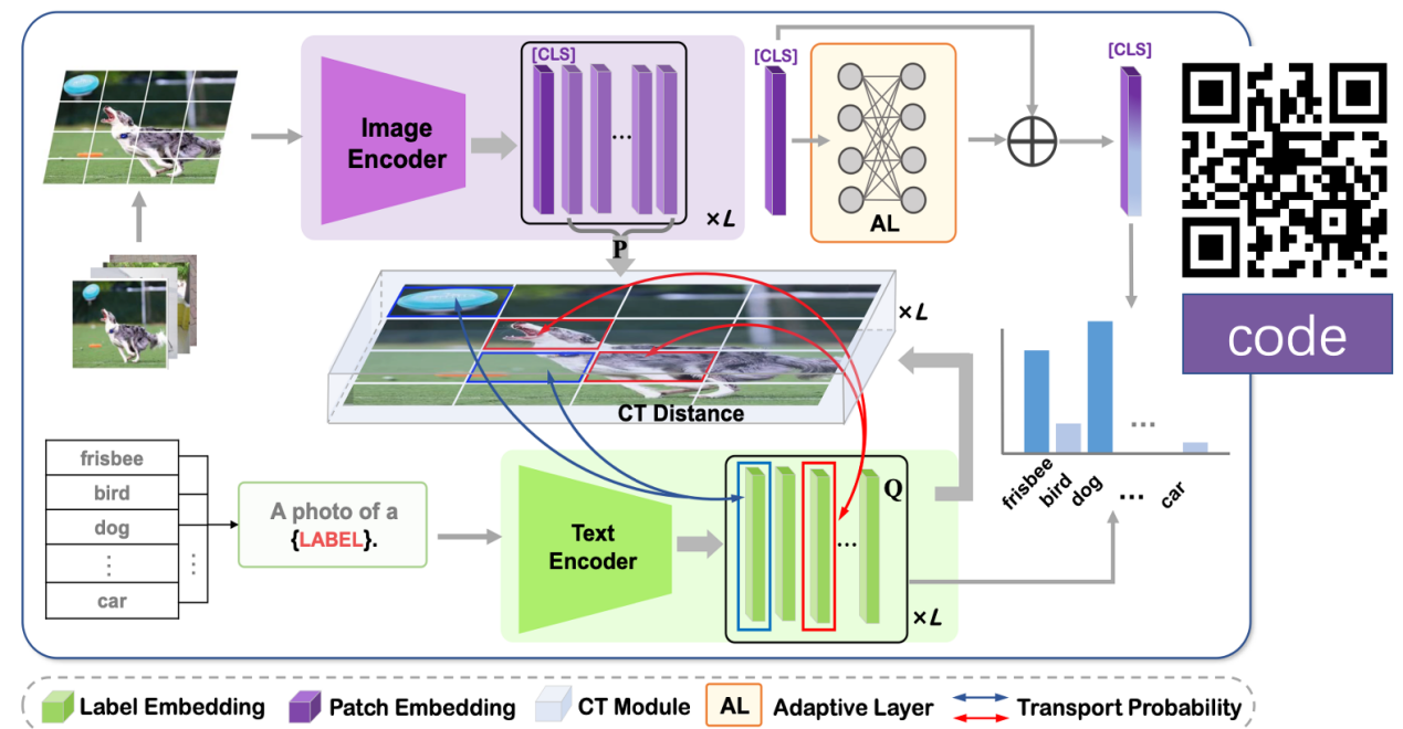 李妙歌碩士與王東升博士合作的“PatchCT: Aligning Patch Set and Label Set with Conditional Transport for Multi-Label Image Classification”,PatchCT是該團隊條件傳輸(Conditional Transport)系列工作在圖像多標簽分類的一次嘗試。作者將多標簽分類任務看作圖像-文本模態對齊問題。通過加載預訓練好的視覺、語言編碼器,得到圖片在兩個模態下的不同語義表示,其中視覺模態由多個圖片patch組成,語義模態由相應的類別vector組成。利用條件傳輸理論正則同一圖片的兩種不同語義表示,進而完成多標簽分類任務,在多個數據集上實現Sota結果,為多標簽分類領域提供了一種新的解決思路。