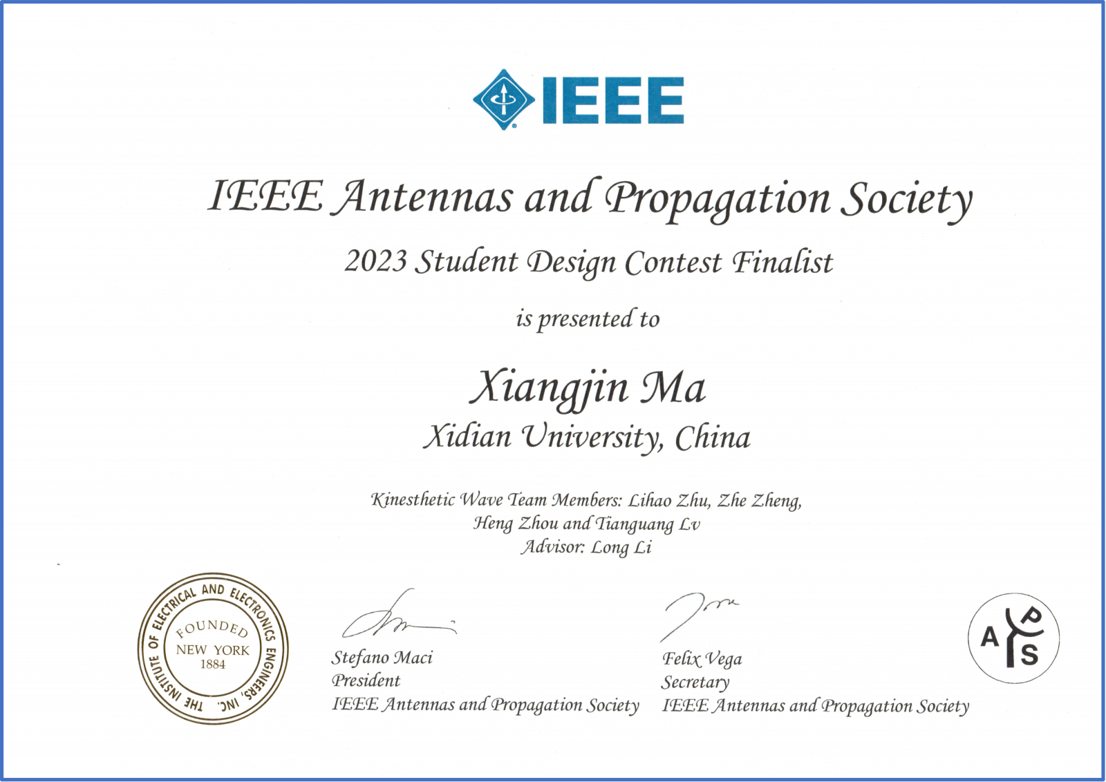 本著“研賽學融合、本碩博貫通”的育人理念,李龍教授“電磁超材料創新團隊”博士生馬向進、朱利豪,電子工程學院2019級卓越班本科生鄭哲、本科生周桁和呂天廣組成五人攻堅小組“Kinesthetic Wave Team”,對本屆大賽進行了數月的積極備戰。五名隊員在李龍教授的悉心指導下,從難題梳理、方案論證,到仿真調參、設計加工,再到搭建樣機、系統聯調,經過重重考驗和層層選拔,最終所提交的作品“基于雙線極化2-bit智能超表面與DOA估計的自適應定位通信系統”在眾多參賽作品中脫穎而出,以創新的設計、豐富的功能和優異的性能,斬獲全球Finalist前六名優勝獎,同時獲得IEEE APS大會提供的1500美元設計費和5000美元的Travel Grand,創下了西電在該國際大會競賽上的歷史最好成績。
