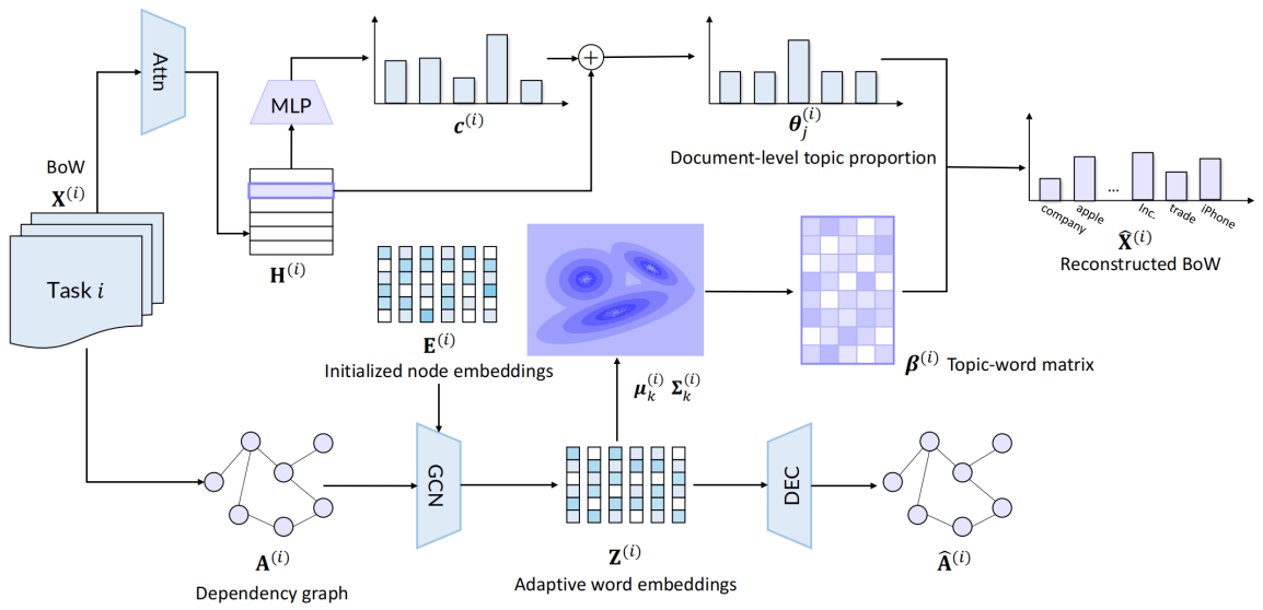 徐逸石與孫劍橋合作的《Context-guided Embedding Adaptation for Effective Topic Modeling in Low-Resource Regimes》延續了團隊在認知深度概率模型的系列工作,該文針對資源不足條件下的主題建模提出了一種融合語境知識的框架。該框架的核心思想是通過整合當前任務的上下文信息來幫助生成自適應的詞嵌入,其整體流程圖如下圖所示。具體而言,通過引入一個變分圖自編碼器對基于任務文檔的語境提煉出的語法依賴圖進行編碼,可以學習到語義匹配當前任務的詞嵌入。然后利用高斯混合模型對分布式的詞嵌入進行建模,將每個混合分量視為一個主題的表示,該方法很自然地提供了一種聚類的視角來學習主題,這有助于盡可能地發現多樣化的并且與當前任務緊密相關的主題。