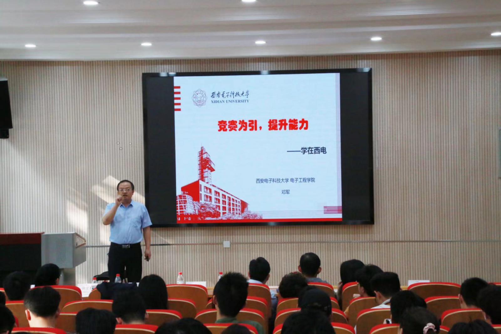 鄧軍教授以“競賽為引,提升能力”為主題,給同學們做了一場精彩的報告。報告包含了四個板塊,以科研競賽的類型為開端,讓同學們認識了各種競賽;其次為同學們生動的講述了實踐思路及具體做法,并分享了歷年指導學生競賽獲獎的成果及經驗總結。鼓勵同學們積極參與競賽,通過參加各種競賽,層層拔高,實現個人能力的提升,最終實現“學業有成日,報效祖國時”的遠大抱負。