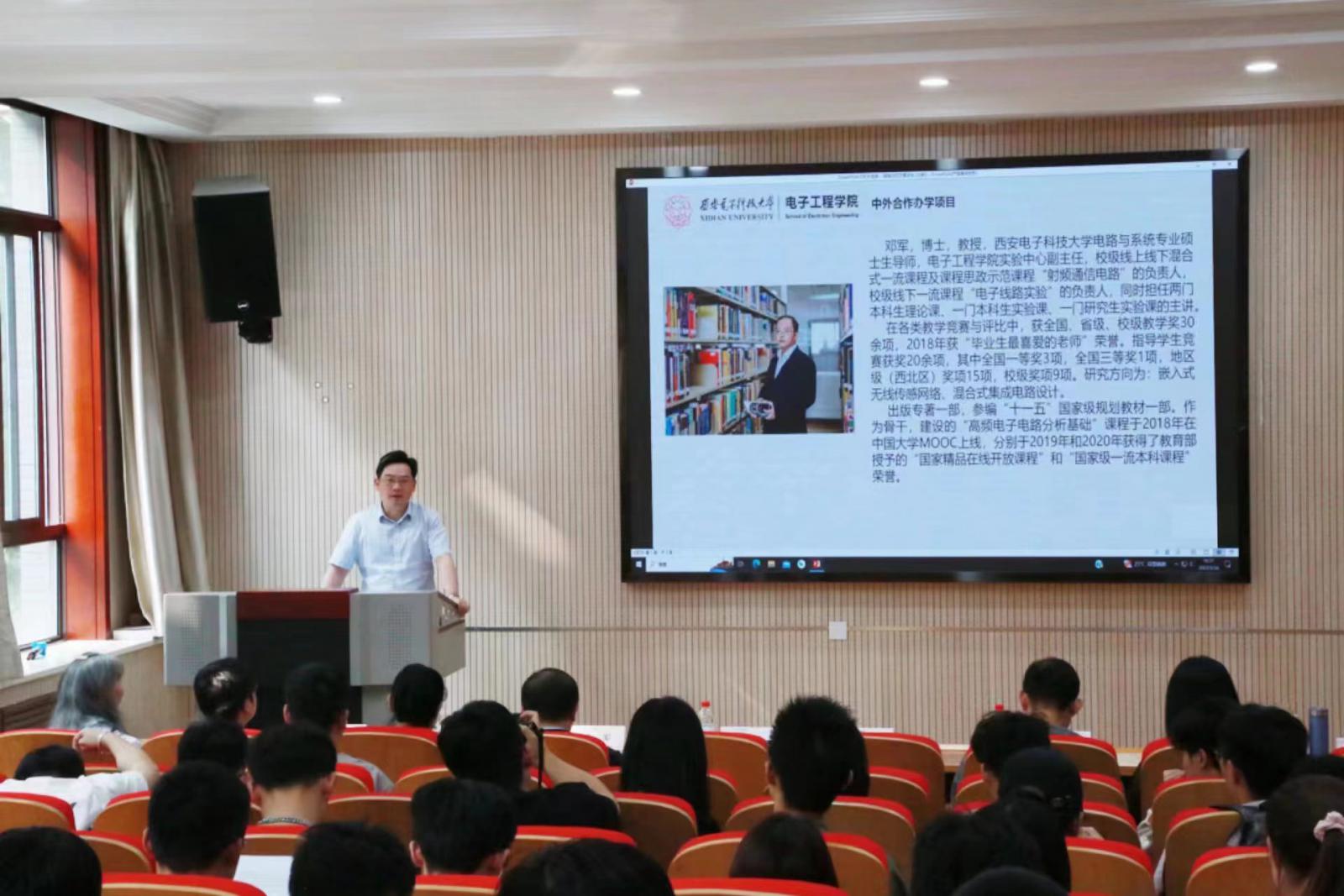 (通訊員施慎行 吳媛媛)為了提升中法班同學們的科研素養,加強對學科競賽的認知,激發同學們參與科研競賽的興趣,5月24日下午,中法合作辦學項目特邀電子工程學院實驗中心副主任鄧軍教授為2022級同學做了一場關于科研競賽的報告。學院副院長李龍、中法合作辦學項目辦公室主任胡海虹、副主任宗汝、中法班各年級班主任及辦公室教師代表參加了本次活動。活動由辦公室主任胡海虹主持。