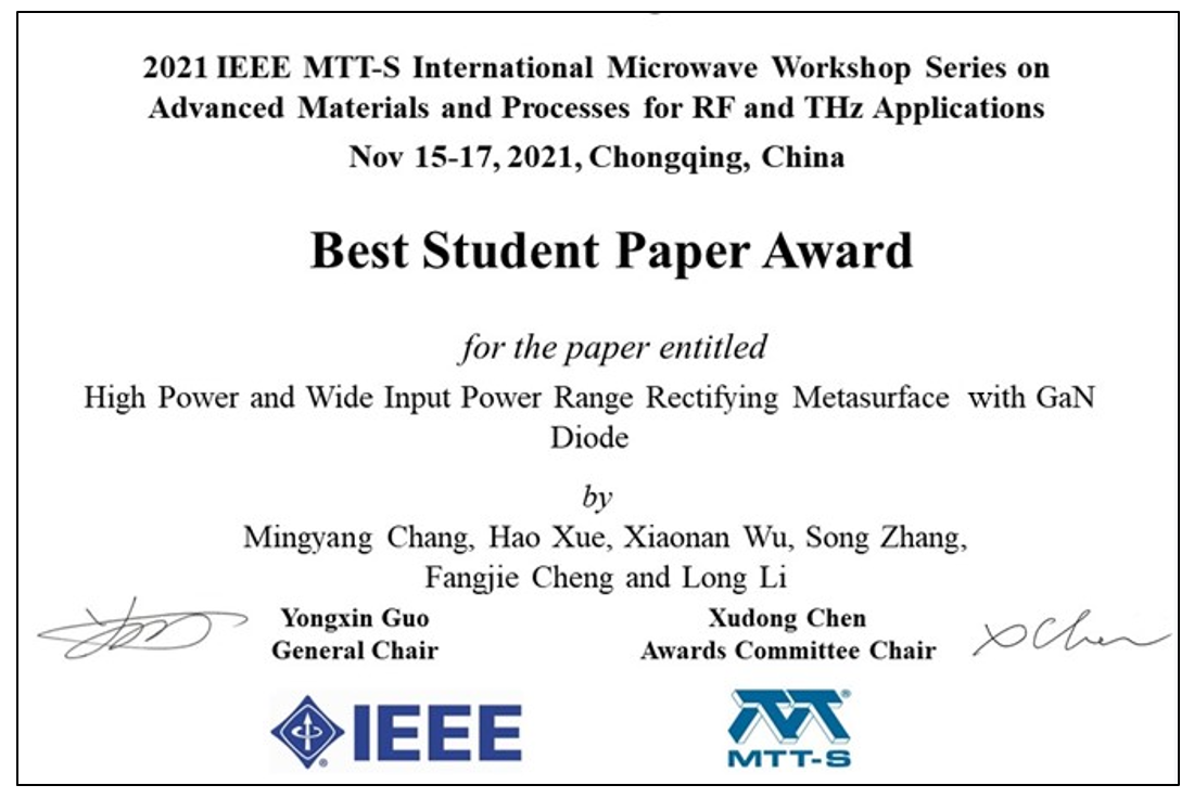 為鼓勵高校學生不斷學習創新,取得更多的科研成果,本次大會還進行了“最佳學生論文競賽”。從會議收錄的論文中,經大會技術委員會專家的嚴格篩選與評審,確定23篇學生論文入圍競賽候選資格。此23篇論文的作者在最佳學生論文競賽答辯中展示了自己的論文成果,并回答了現場評委的相關問題,通過層層比拼,最后有六篇文章依靠論文質量與展示內容的總成績,獲得“最佳學生論文獎”。其中,我院李龍教授的博士研究生常明揚和薛皓等人的文章“High Power and Wide Input Power Range Rectifying Metasurface with GaN Diode”經過逐輪角逐,最終成功脫穎而出,榮獲“最佳學生論文獎”。