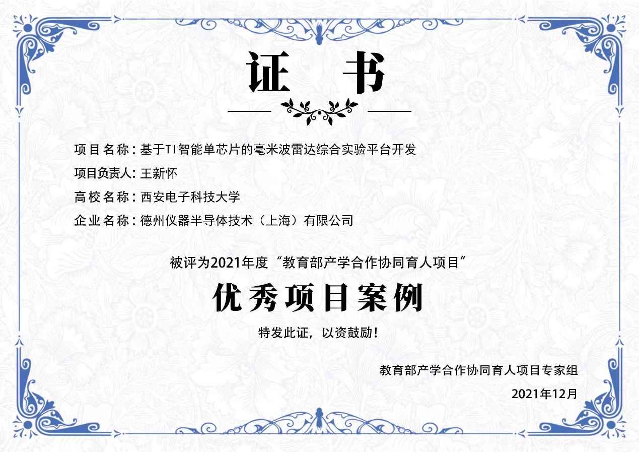(通訊員徐茵)12月8日至9日,由教育部產學合作協同育人項目專家組主辦的 “2021年度教育部產學合作協同育人項目優秀項目案例評選”活動落下帷幕,我院王新懷教授團隊(成員周佳社、徐茵、李亞超、劉潔怡等)的“創新創業教育改革”類項目《基于TI智能單芯片的毫米波雷達綜合實驗開發》獲評2021年度教育部產學合作協同育人項目優秀項目案例,該類別項目全國僅8項入選。