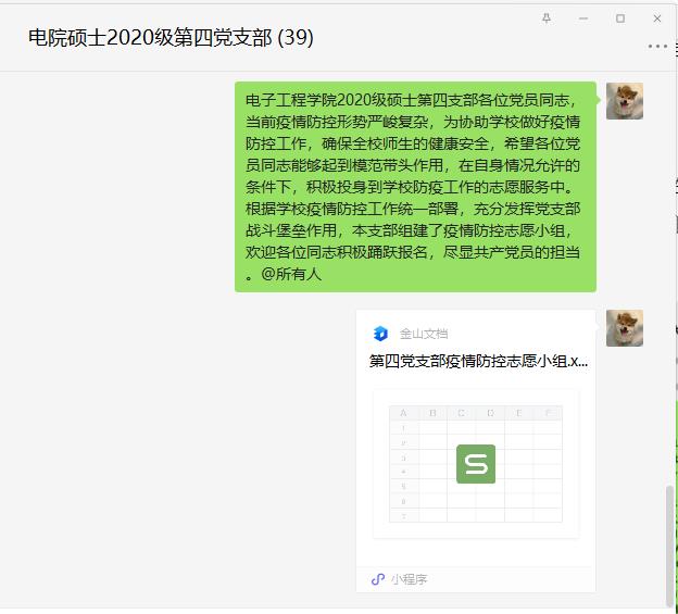 碩士20級第四黨支部黨員李文華,為緩解抗疫壓力,主動請纓,為抗擊疫貢獻自己的力量;碩士20級第四黨支部發布志愿者倡議書,組織黨員組建疫情防控志愿小組。倡議書一發,各位黨員同志積極響應,紛紛加入志愿者隊伍。組內黨員同志時刻處于待命狀態,確保遇到工作任務時,能夠第一時間頂的上。