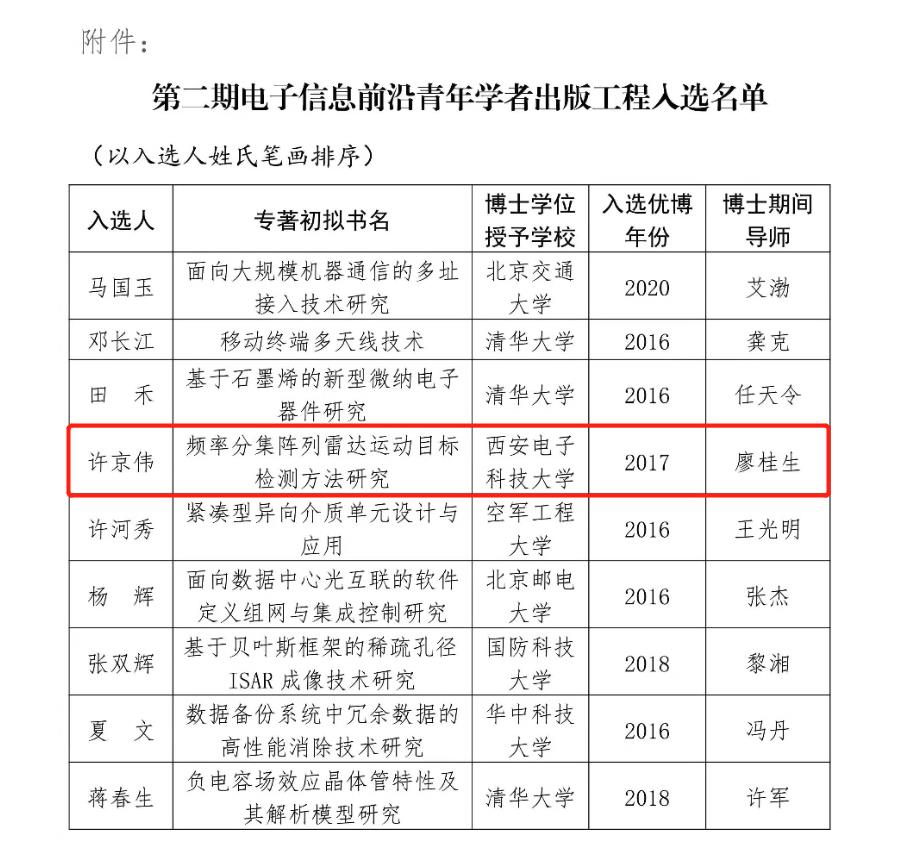 (通訊員牛婷鈺)12月28日,由國務院學位委員會電子科學與技術學科評議組指導,中國電子學會和人民郵電出版社有限公司共同開展的第二期“電子信息前沿青年學者出版工程”評選結果揭曉。西安電子科技大學雷達信號處理國家級重點實驗室許京偉副教授成功入選。