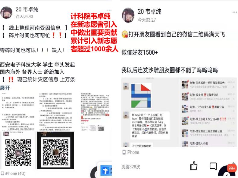 7月22日晚上,志愿者團隊通過分析線上救援大數據后發現鄭州的情況在逐步好轉,同時河南新鄉市等地出現更多的求助信息,志愿者團隊隨即轉移工作重點,將工作重心投入到更多需要幫助的區域。7月23日新鄉市汛情受災嚴重,羅宏亮和其他志愿者工作者在23日凌晨加班工作,當時十分鐘內在線文檔修改完善537次,錄入求助信息和物資信息160余條。24日凌晨3點多,羅宏亮得知河南新鄉市鳳泉區化纖廠生活區39號樓小孩和老人體力透支急需救援,迅速聯系救援人員救助受困人員。此時志愿者團隊已經號召西電160余名學子參與志愿者服務,“與豫”志愿者團隊團隊總人數達到900余人。羅宏亮同時建議志愿者團隊成立參與緊急救援的高校志愿者聯盟,越來越多的高校志愿者加入到“與豫”志愿者團隊。西電計算機科學與技術學院韋卓純同學大力宣傳河南抗擊汛情志愿服務工作,西安電子科技大學參與志愿服務團隊學生達到300余人,并引導社會各方面志愿者1500余人加入到志愿服務隊伍。