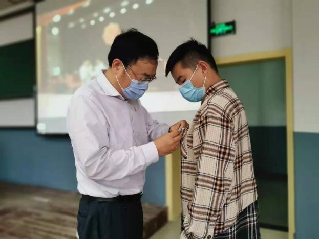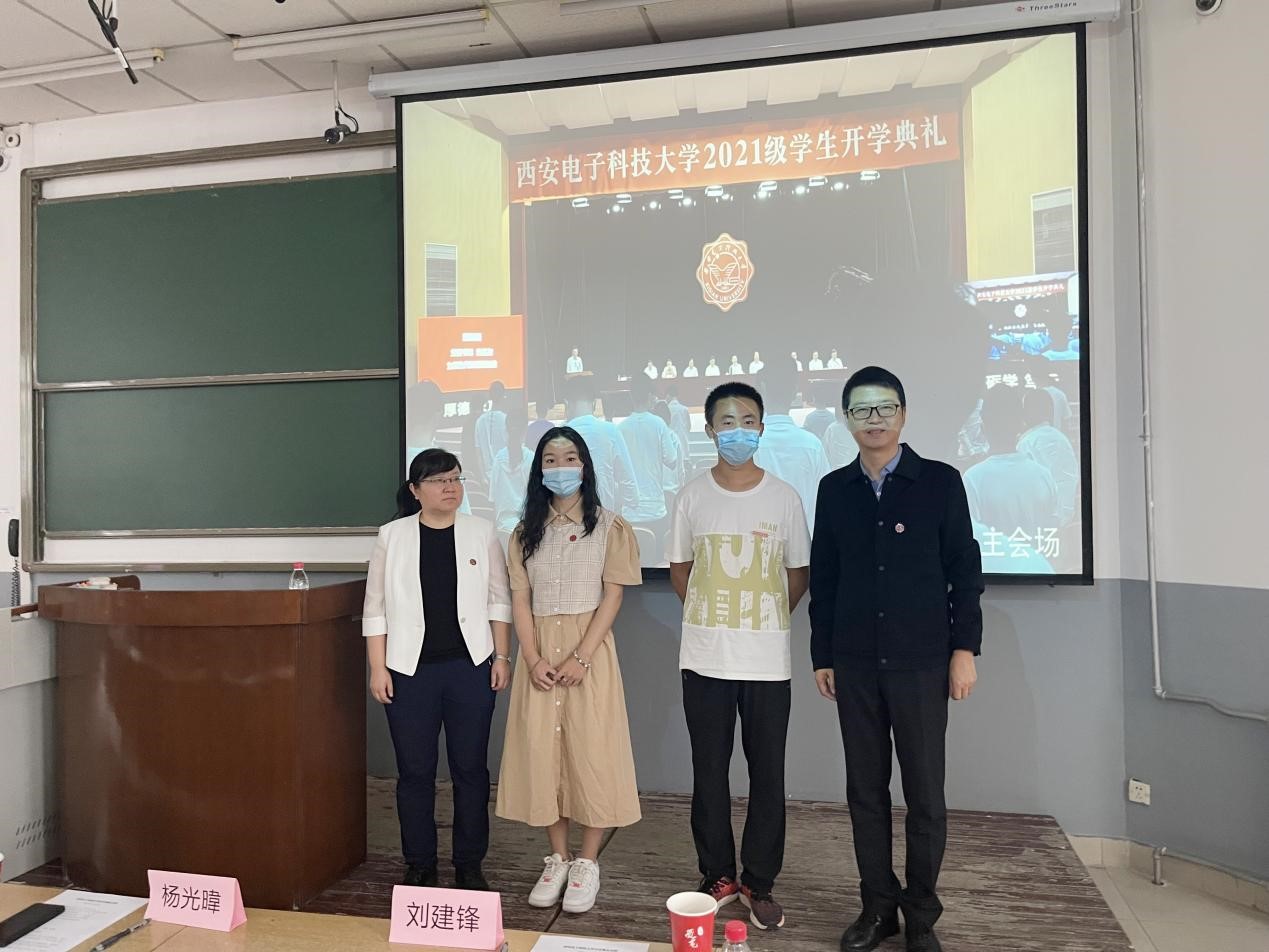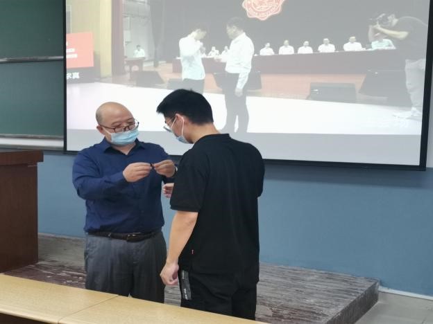 2021級新生成杰同學說:“我曾經就讀于電院本科電子信息工程專業,由分會場領導為我佩戴校徽,倍感溫暖和光榮。希望研究生階段,在學院和導師的引領下,實現自己的人生價值,為西電的科研事業添磚加瓦、再創輝煌。”