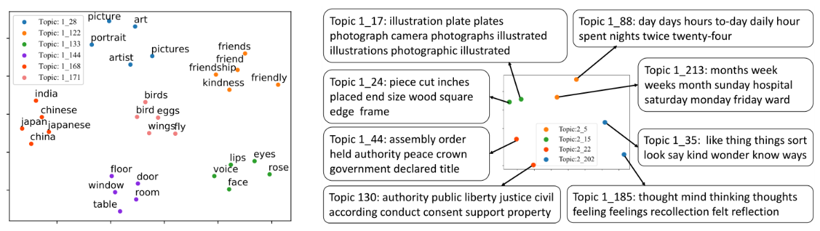 圖2:(a)單詞與主題向量投影(b)不同層的主題向量投影