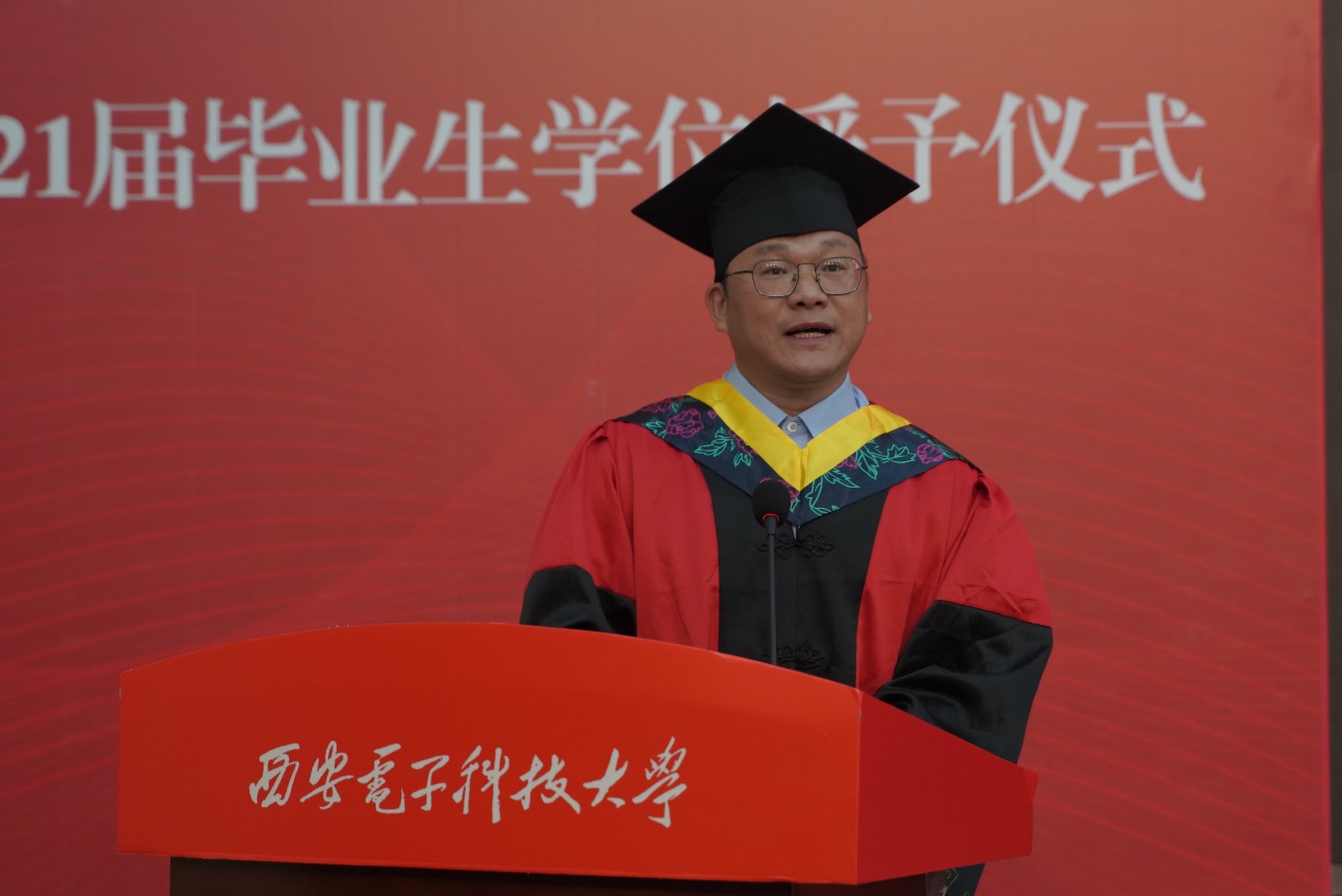 學院畢業生代表張珂鑫同學回顧了自己大學四年的成長經歷,代表全體畢業生表達了對師長的感謝,并希望每一位同學銘記在西電收獲的友誼和感動,在各自的領域為西電增光添彩,傳承西電紅色基因!