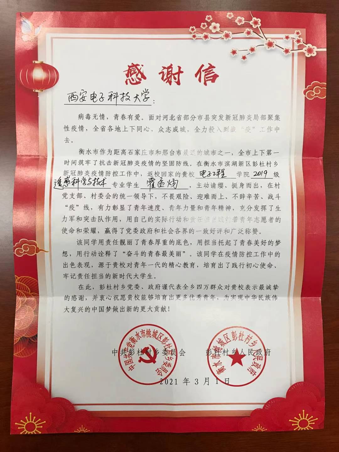 (通訊員王丹)近日,我校收到了來自河北省衡水市桃城區彭社村的一封感謝信,信中對電子工程學院2019級遙感科學與技術專業學生霍孟煬,在2021年初河北衡水疫情防控期間,積極參與當地社區疫情防控工作給予了高度評價,并表示了誠摯的感謝。