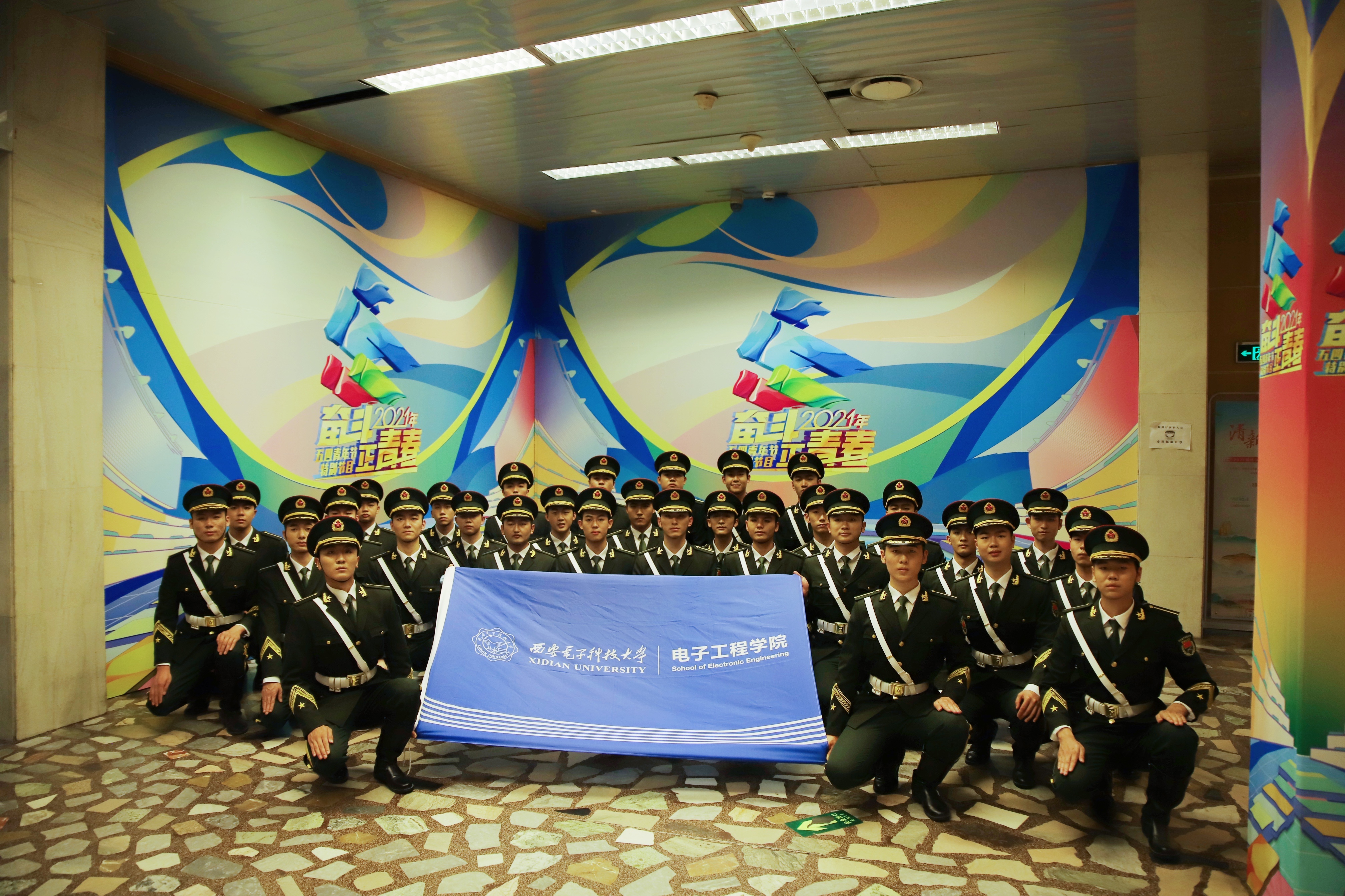 參演學生趙思垚說:經歷臺前幕后訓練、排練與演出的難忘經歷,我不僅結交了來自各高校的新朋友,熟識了細心負責的老師,更體會到新時代青年英姿颯爽的氣魄與堅韌頑強的精神。舞臺位置、動作和節拍的悉心教導,雨天訓練中的溫暖咖啡,排練到凌晨的嚴格與堅守……帶隊老師的照顧與陪伴,是我們辛苦訓練中最溫暖的后備。音樂響起時挺拔的軍姿、行軍禮時堅定的目光和筆直的身軀,訓練過后帽檐下的汗水和酸痛的肩背,辛苦訓練間隙抽空復習信號與系統……30名“戰士”的堅韌頑強,只因為我們“西電國旗護衛隊”肩章上沉甸甸的責任。