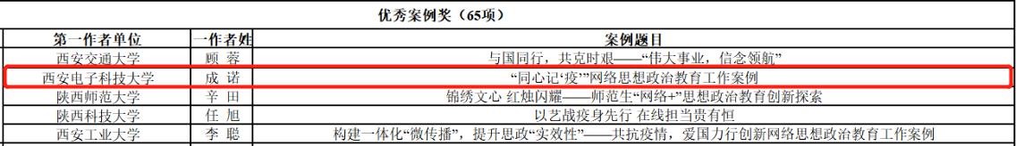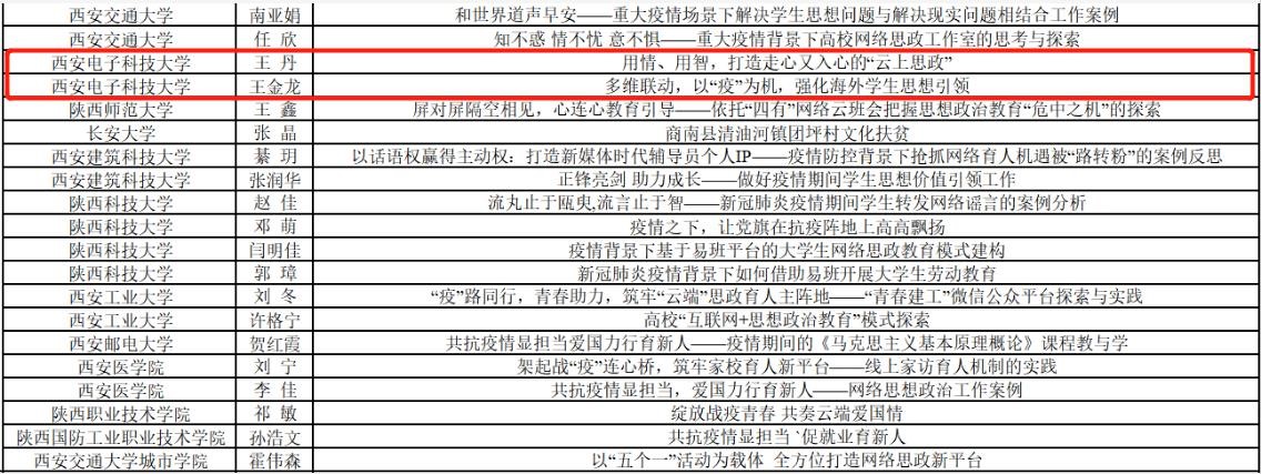 據悉,本次活動由陜西高校網絡思想政治中心組織,以“共抗疫情顯擔當 愛國力行育新人”為主題,共收到省內41所高校的207件作品,最終決出一等獎5項、二等獎10項、三等獎20項、優秀獎30項,我校共有9名輔導員獲獎。