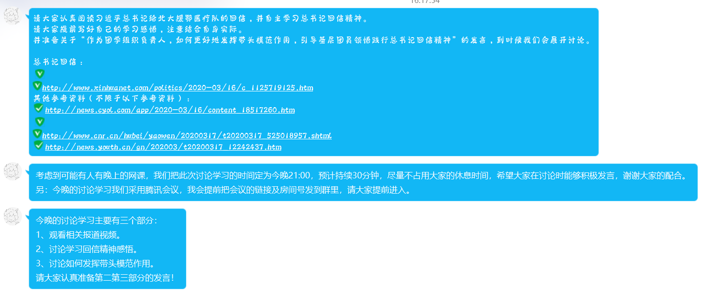 3月17日晚,電院團委負責同學帶領團學骨干們觀看了新聞聯播相關報道,并認真閱讀了習近平總書記的回信。回信中指出,在新冠肺炎疫情防控斗爭中,青年人同在一線英勇奮戰的廣大疫情防控人員一道,不畏艱險、沖鋒在前、舍生忘死,彰顯了青春的蓬勃力量,交出了合格答卷。廣大青年用行動證明,新時代的中國青年是好樣的,是堪當大任的!青年一代有理想、有本領、有擔當,國家就有前途,民族就有希望。希望青年在為人民服務中茁壯成長、在艱苦奮斗中砥礪意志品質、在實踐中增長工作本領,繼續在救死扶傷的崗位上拼搏奮戰,帶動廣大青年不懼風雨、勇挑重擔,讓青春在黨和人民最需要的地方綻放絢麗之花。