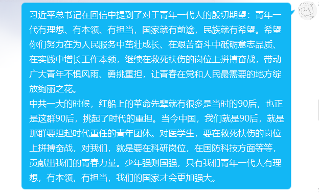 (通訊員:劉昊 張校煜)“中共一大時,作為13位一大代表之一,毛澤東只有28歲,這也是13位中共一大代表的平均年齡,正是這群年輕人,挑起了那個時代的重擔;今天的90后,與那時的先輩年齡相仿,也要勇挑新時代重擔,貢獻出我們的青春力量。少年強則國強,只要我們青年一代人有理想、有本領、有擔當,我們的國家就會更加強大!”電院團委書記助理孟嵩皓同學在學習完總書記回信后激動的說。3月17日,電子工程學院團學組織的30余名團學骨干在線集體學習了習近平總書記給北大援鄂醫療隊全體“90后”黨員的回信精神,氣氛熱烈。