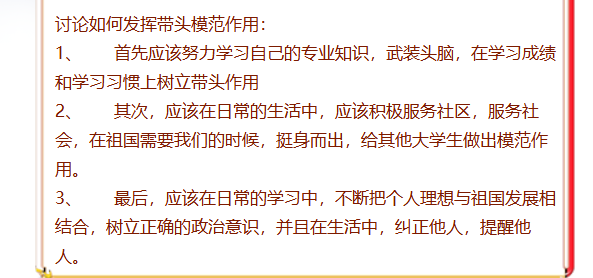 最后,電院團學組織骨干們圍繞團學組織骨干如何更好地發揮作用,引導基層團員領悟踐行總書記回信精神展開了熱烈討論,獻言獻策,為做好下一步班團組織工作提出了意見建議。大家一致認為,要做到“有理想,有本領,有擔當”,要成為能夠擔得起時代重任的青年人,最首要的就是要堅定理想信念,通過一言一行去引導提醒身邊的同學;其次,要提高綜合素質,在實踐中去鍛煉提高;除此之外,要盡最大努力在幫助同學學習生活上做出表率,充分發揮骨干的模范帶頭作用。
