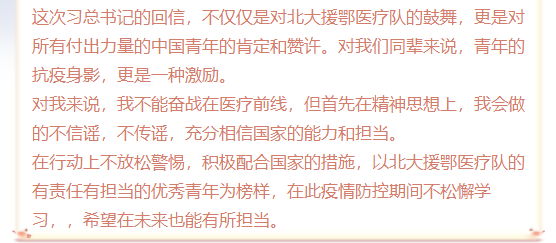 電院團委信息部負責人史庭磊說到:“在這次疫情中,涌現出了無數的英雄,他們逆流而上,沖鋒在疫情的第一線,他們與疫情賽跑,與病魔較量,為無數的人們帶去健康,在這其中,九零后展示出了他們自己的力量,為我們展示了青春一代的蓬勃生機,同時我們要學習他們的精神,做到腳踏實地,堅定不怕苦不怕犧牲的信心,將人民群眾的需求放在第一位。最重要的不是幾零后,而是‘努力后’、‘奮斗后’,能夠到祖國最需要的地方去,能夠為國家做貢獻,為人民服務,才是實現人生價值最好的途徑。每個人都有自己的任務,我們也要在我們的位置上做好我們自己,為祖國和人民做出貢獻,奉獻我們的青春力量。”