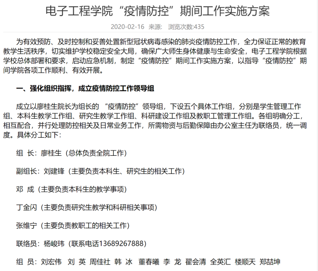 疫情發生后,電子工程學院黨政領導班子第一時間確立“切實保障師生生命安全和身體健康”的總原則,嚴格遵循黨和國家、教育部關于疫情防控的精神指示及學校防控工作總體部署要求,成立學院疫情防控工作領導組,統一指揮調度全院疫情防控工作。