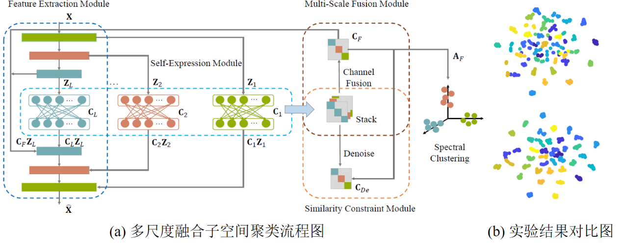 黨致遠博士的論文“Multi-Scale Fusion Subspace Clustering Using Similarity Constraint”設計了一種使用相似性約束的多尺度融合網絡來學習更具判別力的自表示系數矩陣。該方法首次提出融合深度子空間聚類中的多尺度信息,大幅提高了深度子空間聚類在多個基準數據集上的性能。
