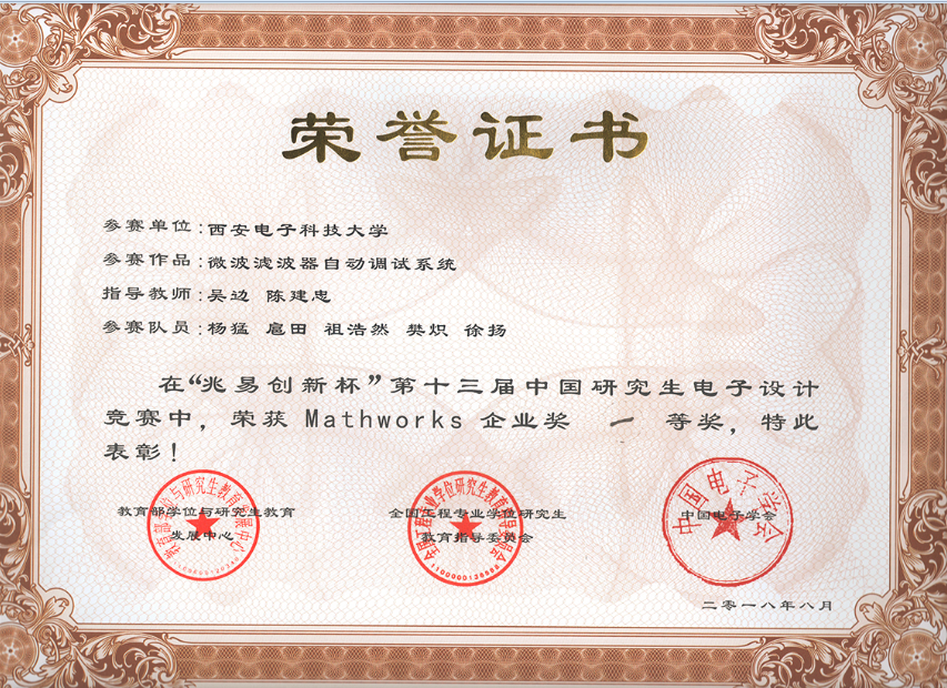 圖4 參賽作品“微波濾波器自動調試系統”獲獎證書