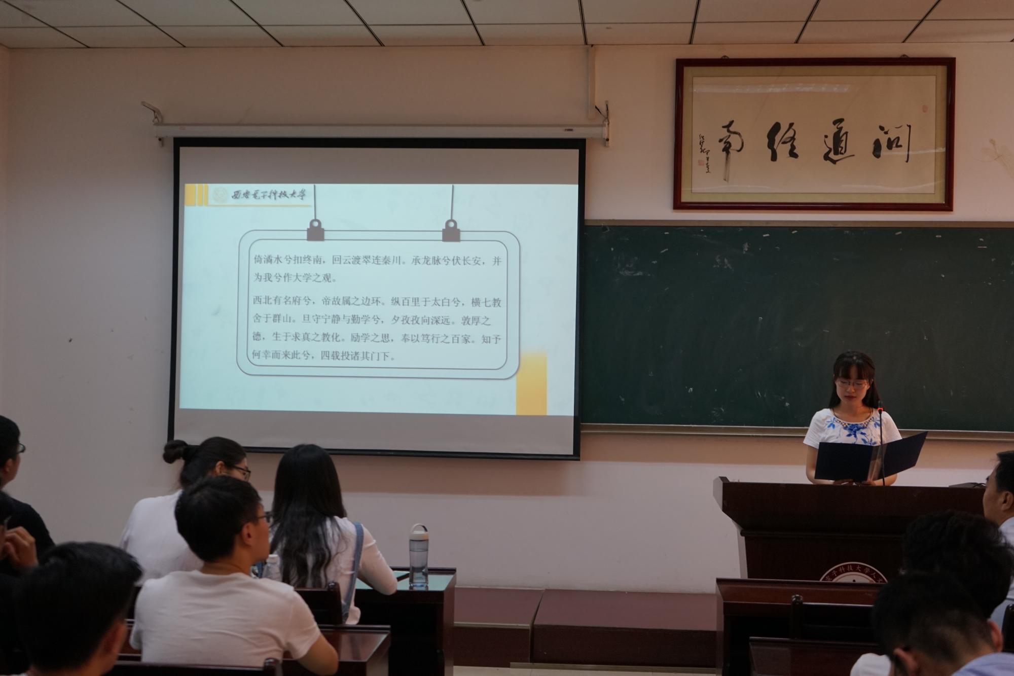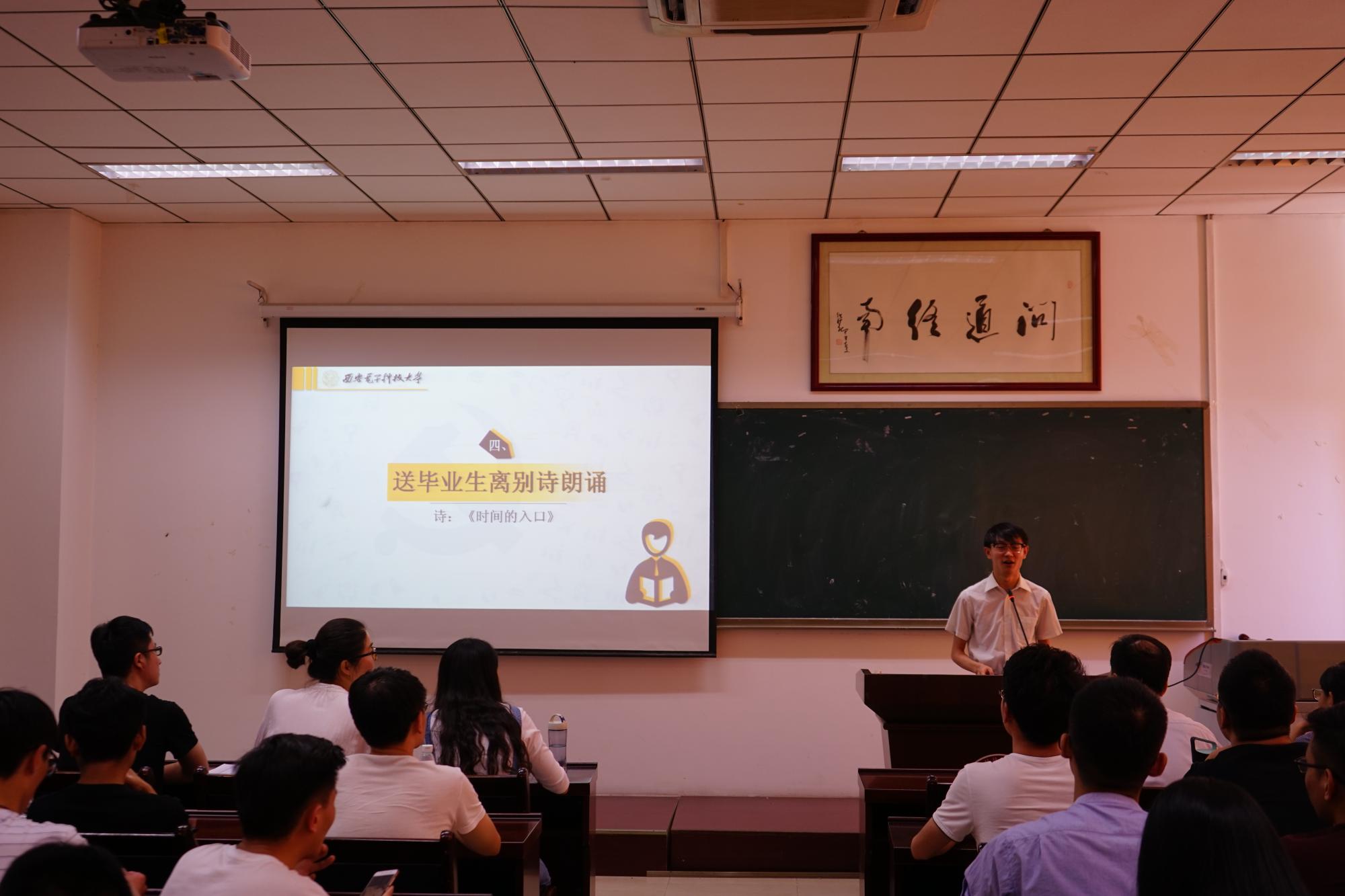 支部會上,畢業生代表李玉蕭同學朗誦了送給母校的自創詞《臨別謝師門行賦》。“旦守寧靜與勤學兮,夕孜孜向深遠”;“歷革命昔之為跡兮,深建功勛于黨”;“謝師恩之浩蕩兮,慕帷幄其經典”;“天涯好珍重,舊意還憐惜!與君幾度同甘苦,人在天涯猶比鄰。他年子弟遂江海之宏志,莫負師門遺涓滴之初心。”優美的旋律,深情的朗誦,傳統詩詞朗誦表達了畢業生奮發有為、再創輝煌的決心和感恩母校的離別之情。