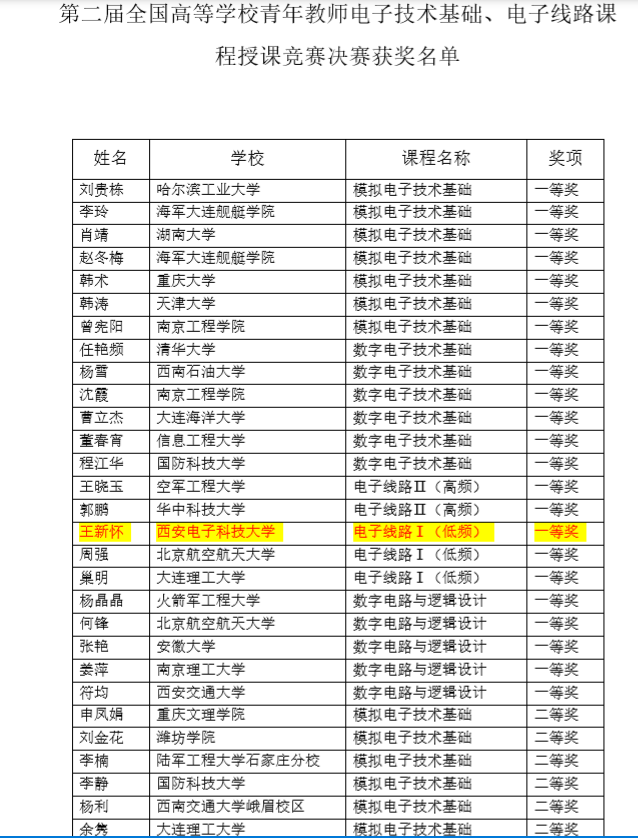 附第二屆全國高等學校青年教師電子技術基礎、電子線路課程授課競賽決賽獲獎公示名單: