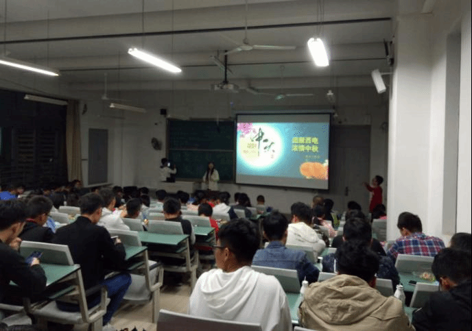 接著,一個幽默的中秋節日視頻過度暖場。視頻過后是中秋傳統文化猜謎語、猜詩詞環節,謎語和詩詞都與中秋節的傳統和習俗相關,這個環節讓在座同學充分感悟到中國傳統文化的魅力。主持人在黑板上寫下了一些謎語,每條謎語都需要一定的傳統文化知識儲備才能答出。接下來的活動就變成了同學們傳統文化和詩詞知識儲備的決斗場。同學們才情與文思涌動,謎底全部被揭曉,文字迷宮一個個被破解。