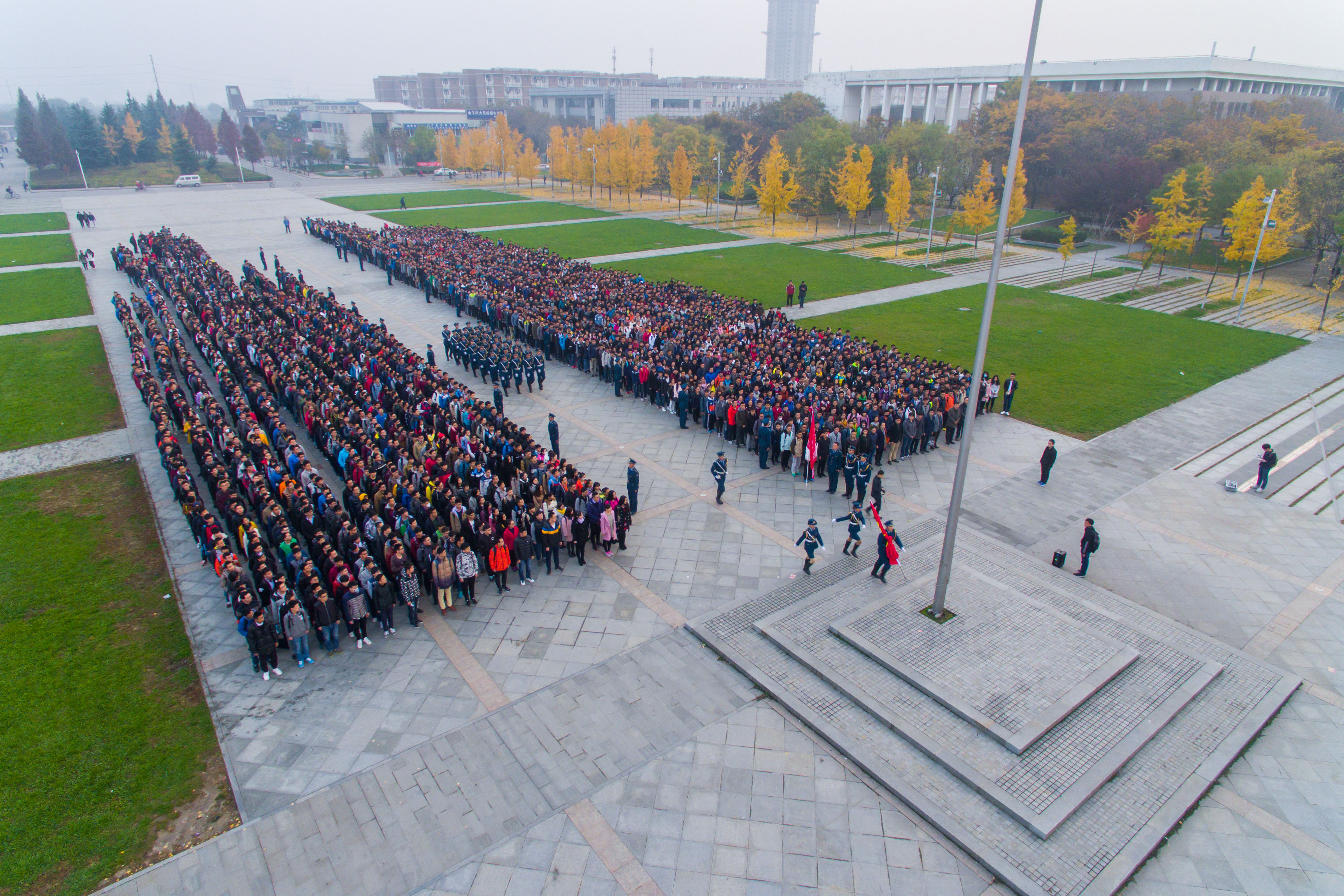 (通訊員錢德年)11月14日早上七點,天剛蒙蒙亮,電子工程學院跑完早操的同學已經在南校區禮儀廣場有序列隊。這一天是電子工程學院4000余名本科生參加升國旗儀式的日子。7:20分,各年級已經按照指定位置列隊,學校國防生國旗班同學已經準備就緒。電子工程學院副書記張海戰老師、全體輔導員老師在學生隊列前面整齊列隊。