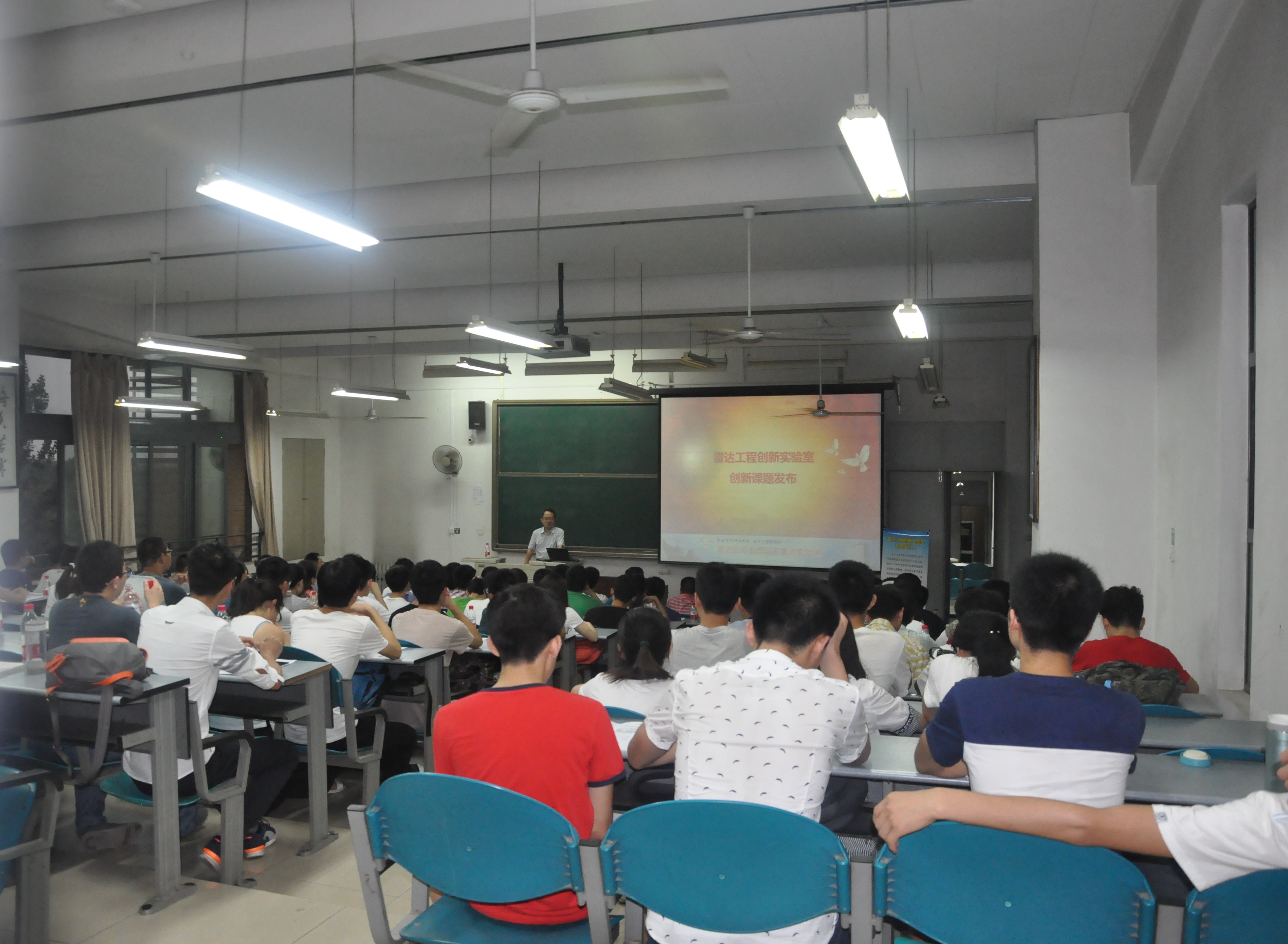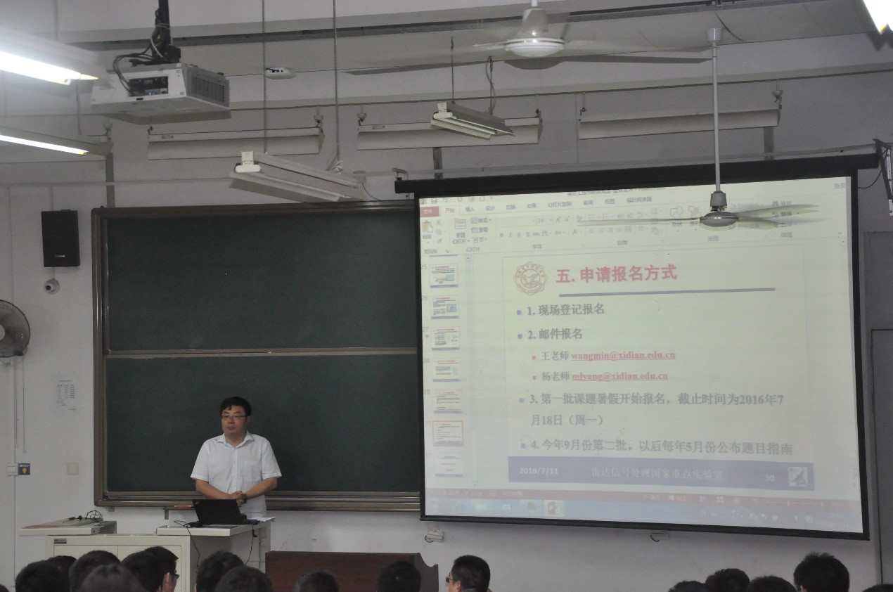 雷達工程創新實驗室是雷達信號處理國家重點實驗室(電子所)設立的面向廣大本科生的電子信息實踐教育和創新工程基地。實驗室于2016年7月11日星期一晚上19:30在南校區B樓411舉行了創新課題發布、報名及相關事項咨詢答疑會,電子工程學院副院長蘇濤教授、雷達信號處理重點實驗室主任劉宏偉教授及部分教師代表參加了發布會,會議由楊明磊副教授主持,一百多名本科生參加了發布會。