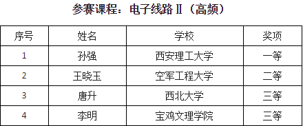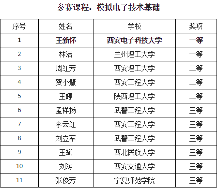 據悉,為貫徹落實教育部高等學校電工電子基礎課程教學指導委員會的意見要求,推動高等學校電子技術基礎、電子線路任課教師專業發展和教學能力的提升,進一步激發教師投入課程建設和教學研究的熱情,電工電子基礎課程教學指導委員會、中國電子學會電子線路教學與產業專家委員會、全國高等學校電子技術研究會定于2016年舉行首屆全國高等學校青年教師電子技術基礎、電子線路課程授課競賽,共分為西北賽區(陜西等六省)、華東賽區、東北賽區、華北賽區、西南賽區、中南賽區。此次授課競賽西北地區共20所高校、總計46名青年教師參賽。參賽課程分為模擬電子技術基礎、數字電子技術基礎、電子線路Ⅰ(低頻)、電子線路Ⅱ(高頻)、數字電路與邏輯設計,經過各組評委對參賽選手的教學課程設計及授課評分,共評出一等獎6名(模電組2名,其他組各1名),二等獎9名,三等獎18名。獲獎名單附錄如下: