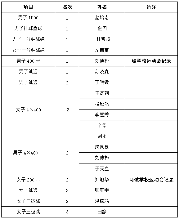 鷹擊長空,魚翔淺底。在強手如林的運動競技場上,我院運動員的賽場表現確是毫無遜色。無論是塑膠跑道上的自由馳騁,亦或是田徑賽場上的輕巧縱躍;無論彩繩揮舞的腳尖點點,亦或是排球墊球的風度翩翩;無論是超越自我的個人項目,亦或是團結協作的團體競賽;處處展現著我院運動健兒的昂揚斗志和颯爽英姿。他們矯捷的身手在眾多參賽者中脫穎而出,更有甚者榮膺第一并破紀錄的美譽,贏得了運動場上的歇斯底里的歡呼和陣陣發自肺腑的喝彩。尤其是林智超、左苗苗、劉穗彬、蘇曉森、趙培志、金閃和鄭敏華同學分別在男子一分鐘跳繩、女子一分鐘跳繩、男子400米、男子跳遠、男子1500米、男子排球墊球、女子200米項目上一舉折桂,劉穗彬同學和鄭敏華同學分別破學校運動會記錄,為我電子工程學院贏得無限榮光。