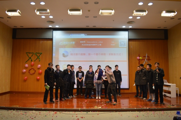 晚上6時許,當《因為愛情》熟悉的旋律響起時,雙旦晚會正式拉開了序幕。主持人風趣的語言,讓晚會氣氛一開始就變得十分熱烈。一場場令人捧腹的表演,一個個轟動全場的游戲,使雙旦晚會精彩不斷。活動部話劇《皇帝選妃》與西電聯系緊密,令觀眾感同身受;科技部魔術《會變的鈔票》使人眼花繚亂;外聯部的歌曲串燒喚起大家對愛情的向往;宣傳部小品《搶劫》的前播視屏展示了他們一點一滴的努力,小品更是十分精彩;外聯部《教室里的那些年》又讓我們回想起曾經的高三歲月;科技部《白雪公主與三個小矮人》、秘書部舞蹈《逗比的春天》以及策劃部壓軸大戲《龍門客棧》均令人應接不暇。而中場游戲“背對背擁抱”運氣球則是幾家歡喜幾家愁,贏的部門收到蘋果,而輸的卻要受到小小的懲罰。晚會最終在《難忘今宵》的旋律中落下了帷幕。