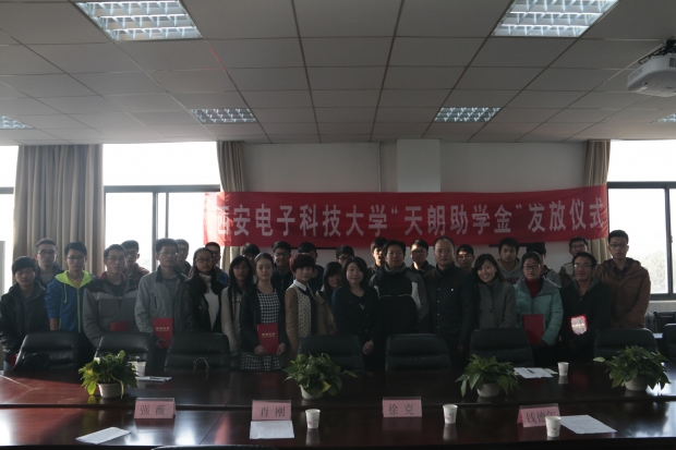11月19日下午,西安電子科技大學電子工程學院“天朗助學金”頒發儀式在南校區行政輔樓310會議室舉行。電子工程學院黨委書記徐克、校友辦公室主任肖剛、天朗控股集團品牌管理部慈善經理葛曉榮出席了頒發儀式。天朗控股集團四位代表為25名同學頒發了“天朗助學金”證書。
