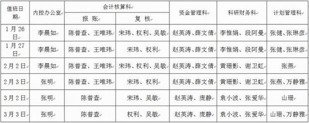 根據學校2015年放寒假時間安排的通知,2015年計劃財務處寒假值班情況安排如下: