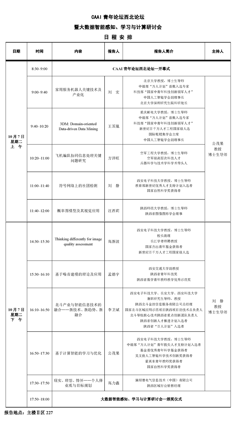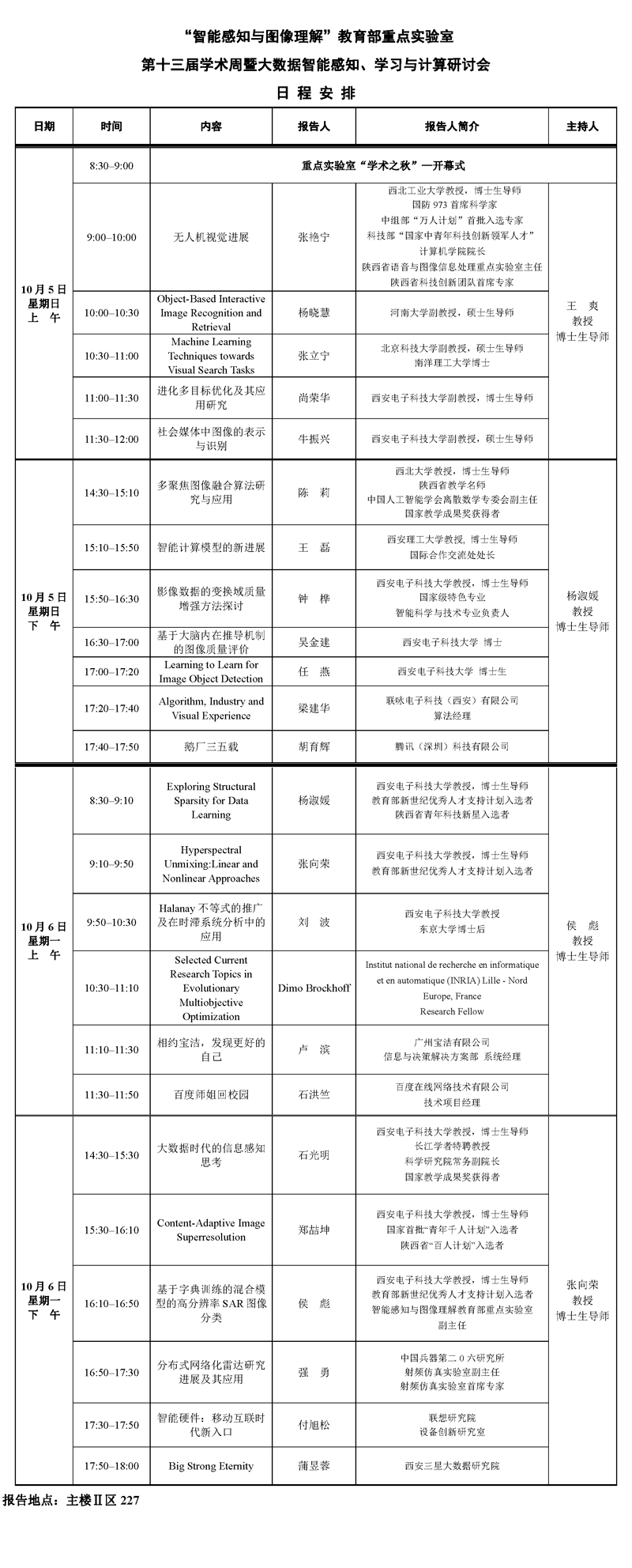 大數據智能感知、學習與計算研討會日程安排 2014-10-03 21:24:00 瀏覽次數: 本屆大數據智能感知、學習與計算研討會10月4日開始10月7日結束,10月5日至10月7日的學術報告安排如下表所示。 上一篇文章:2014年全國智能科學技術教育暨教學學術研討會日程安排 下一篇文章:2014年全國智能科學技術教育暨教學學術研討會日程安排